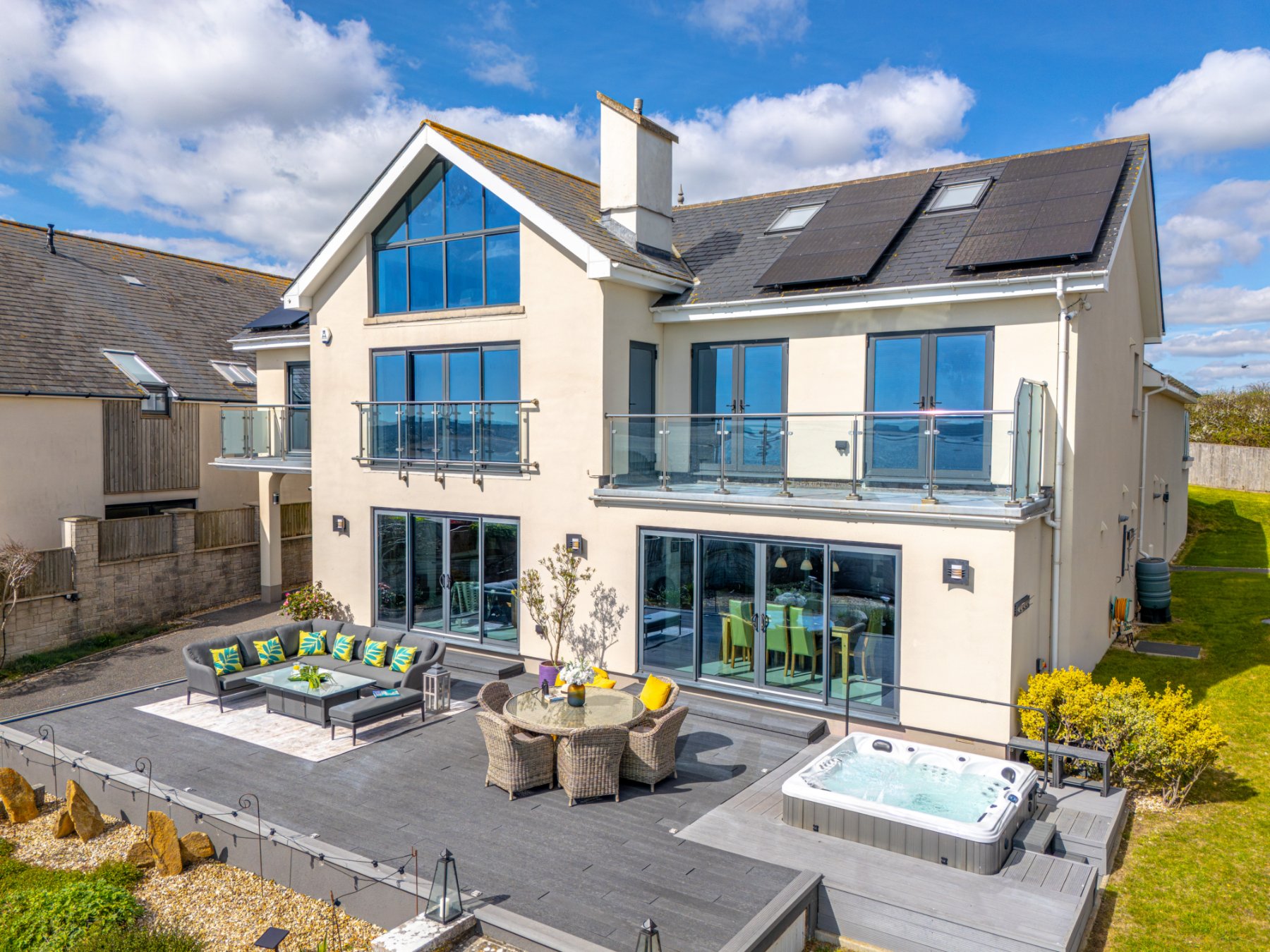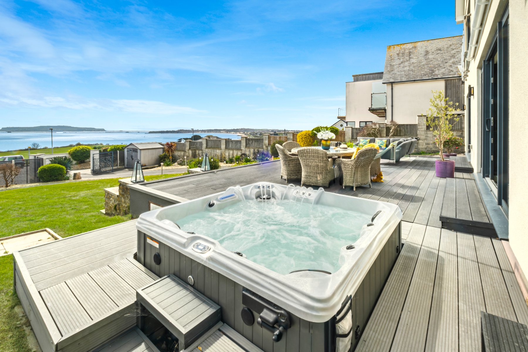 Terraces and balconies extend the living space outdoors, creating ideal spaces for relaxing, entertaining and simply absorbing the surroundings. The main terrace flows directly from the sitting room and kitchen/dining room, encouraging effortless indoor-outdoor living. The addition of a hot tub creates a perfect place to unwind while taking in the coastal setting. The generous balcony adjoining the upper vaulted room offers an elevated private retreat with the outlook shifting to rolling countryside, providing a pleasing sense of balance and privacy.