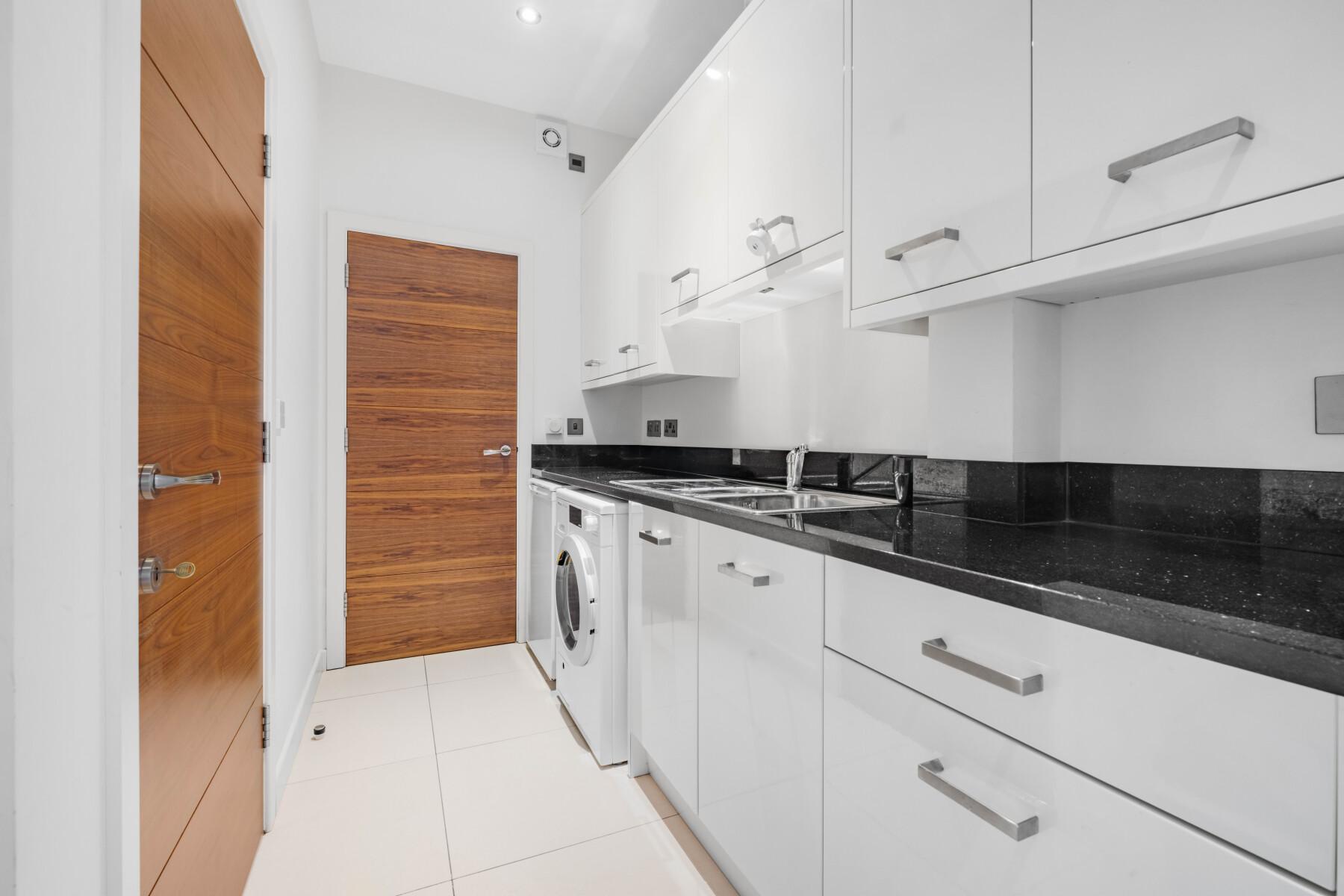 A further reception room adjoining the kitchen is currently arranged as a HOUSE-KEEPER'S ROOM/STUDY, offering flexibility for a variety of uses. The UTILITY ROOM provides extensive built-in storage, plumbing for white goods, and a sink. It benefits from dual access from both the main house and the hallway within the rear extension. With existing services in place, it could readily function as a secondary kitchen serving the upper extension level if desired. A CLOAKROOM and WC complete the ground floor accommodation.