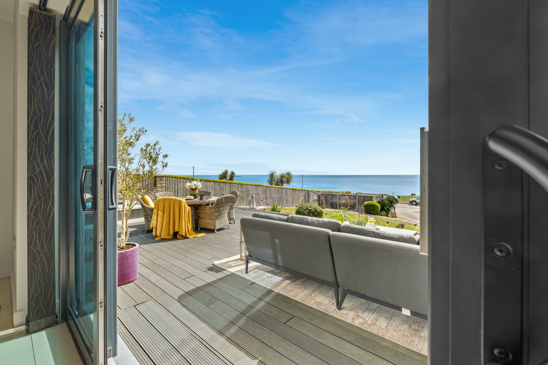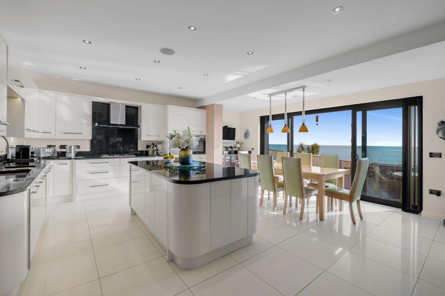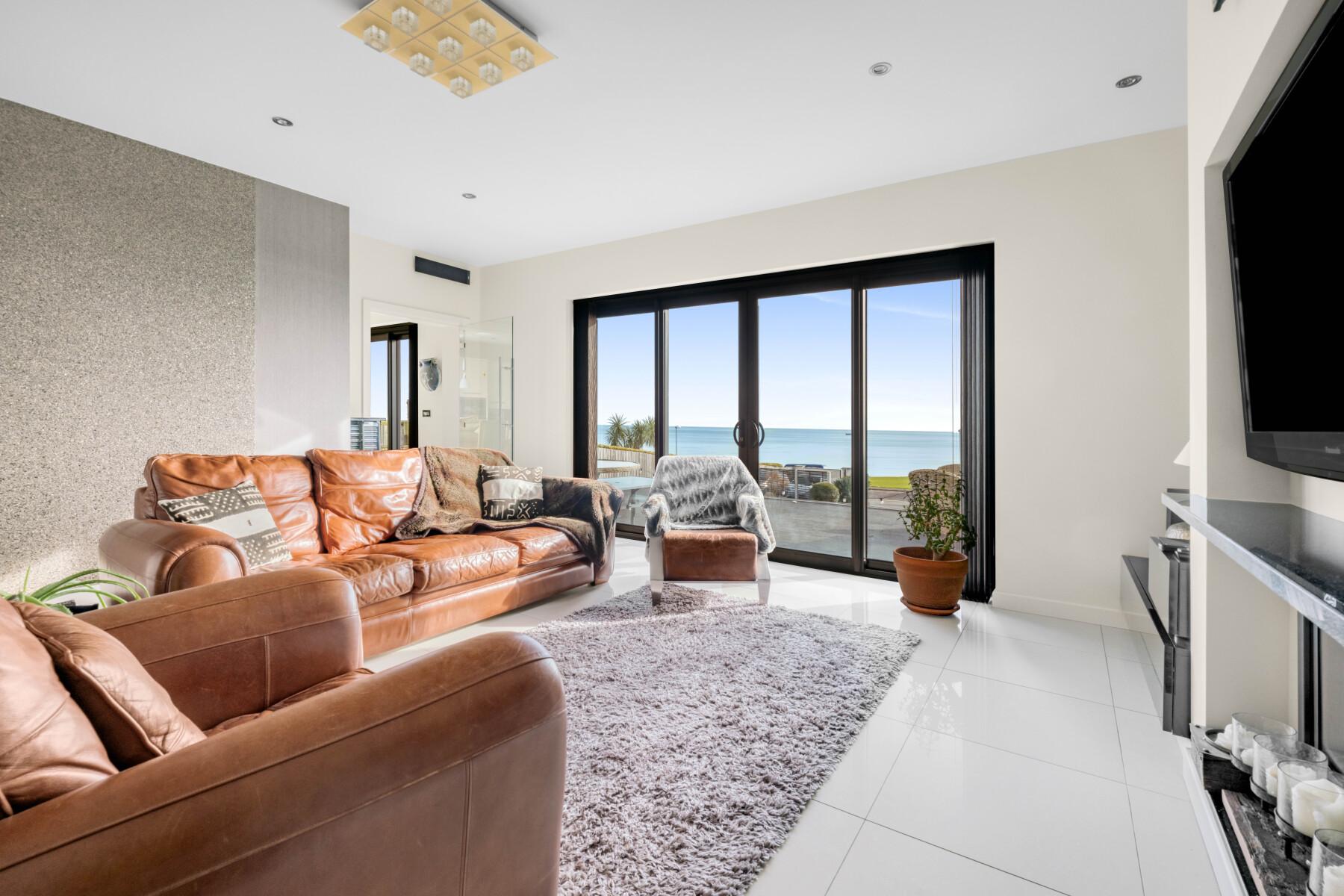 The principal reception rooms are oriented to embrace uninterrupted sea views across Weymouth Bay towards the Isle of Portland and beyond. In the SITTING ROOM, full-height double-glazed sliding doors frame the panorama and open directly onto the terrace, making the coastal landscape part of daily life. A contemporary Gazco Studio 2 gas fire provides warmth and ambience when desired, while underfloor heating and polished flooring enhance comfort and continuity of design.