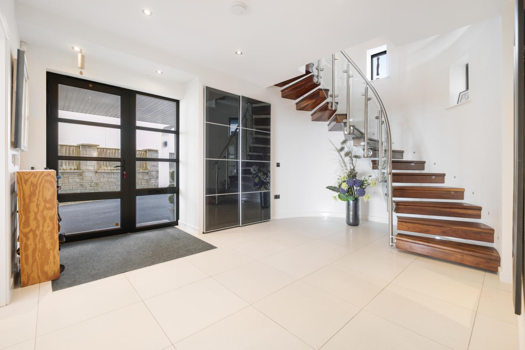 A generous RECEPTION HALL sets the tone on arrival; an impressive space with polished stone flooring and fitted coats cupboard. A bespoke floating double staircase crafted in African walnut rises through the house, illuminated softly by Foscarini conical pendant lights creating a striking ascent to the upper floors.