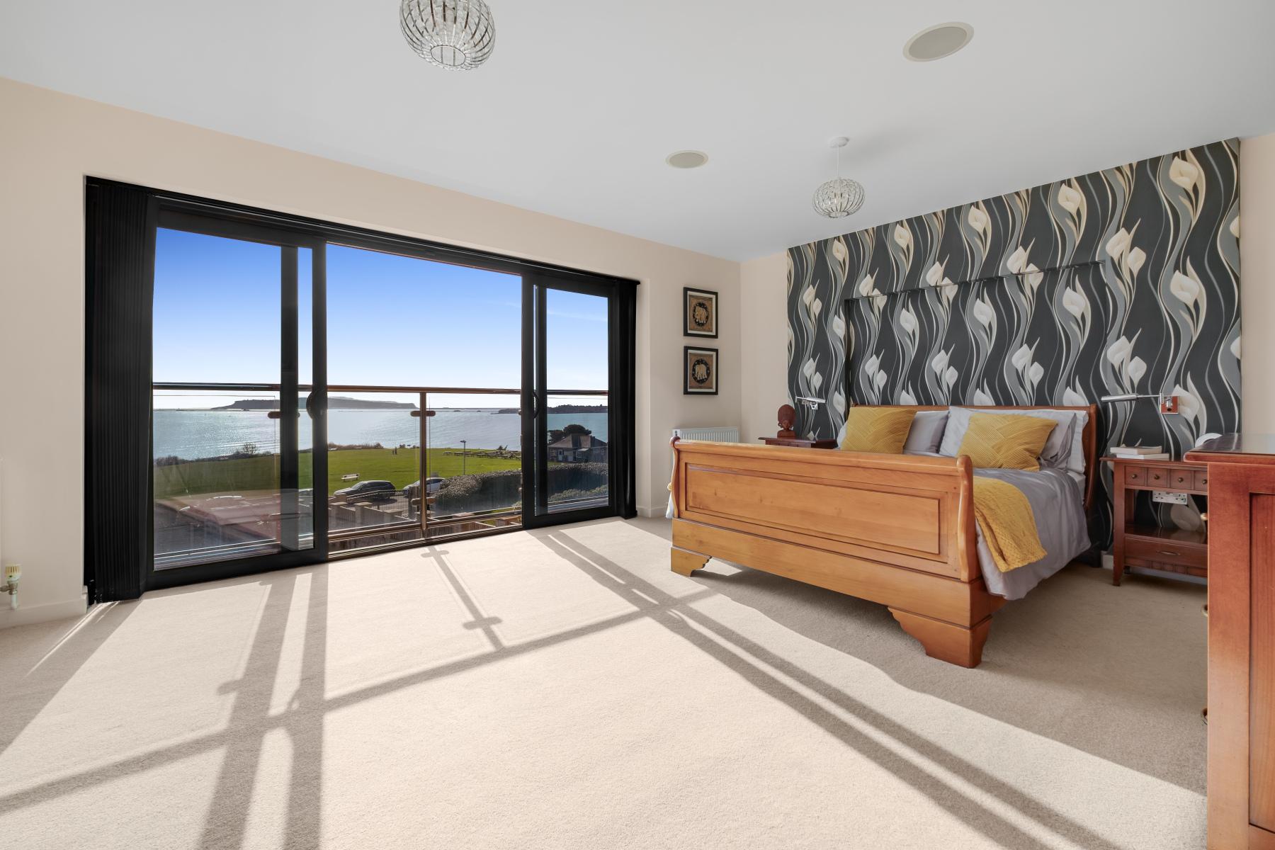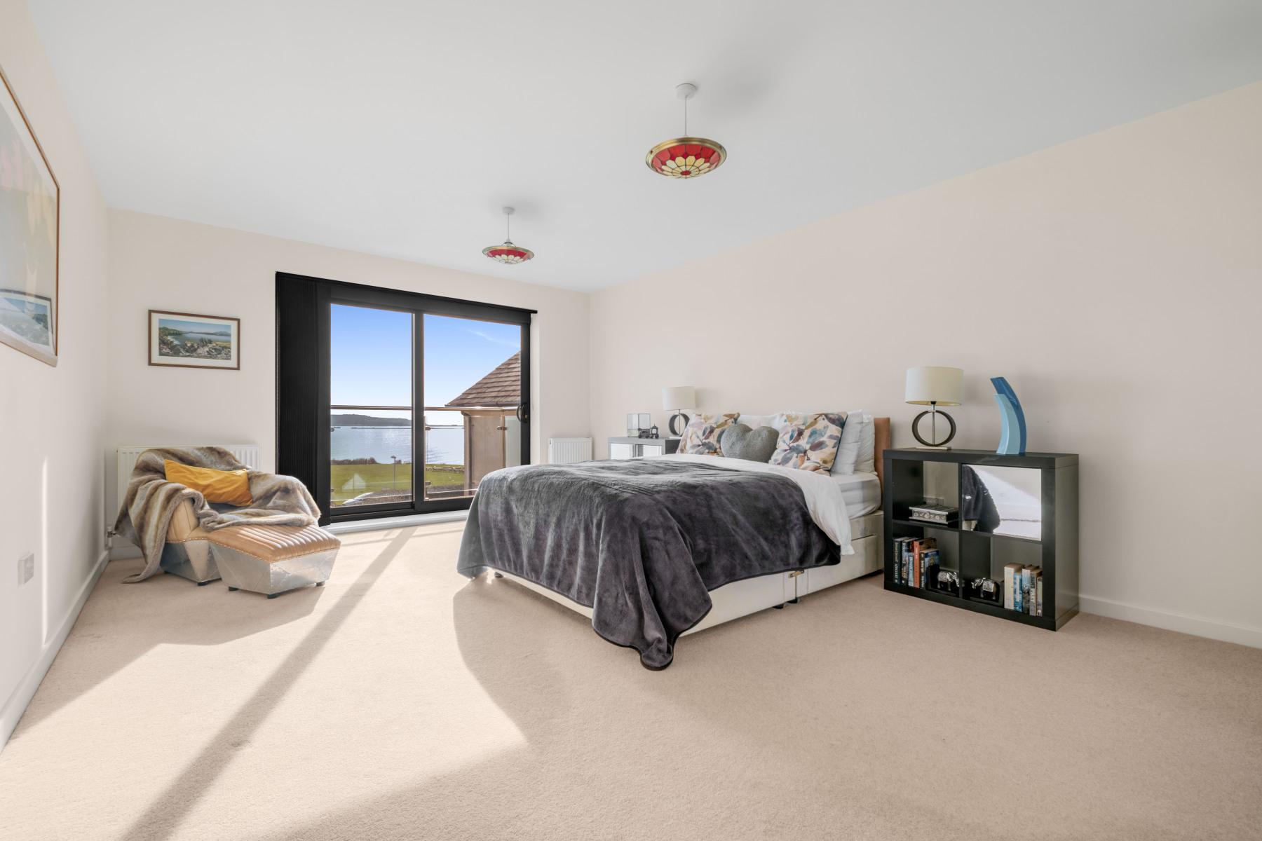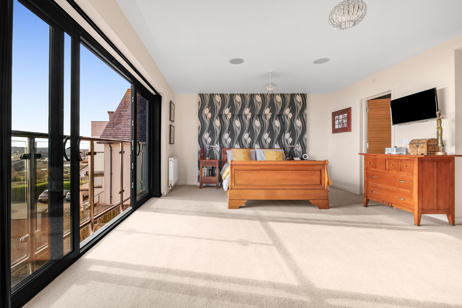 The FIRST FLOOR of the main house provides well-proportioned bedroom accommodation ALL WITH STRIKING COASTAL VIEWS. The PRINCIPAL BEDROOM is a particularly impressive space, enjoying excellent natural light and direct access to both a private Juliet and shared balcony. From here, elevated 180-degree panoramic sea views stretch to the horizon - truly extraordinary. A well-appointed ENSUITE SHOWER ROOM is finished in a clean, contemporary style.
