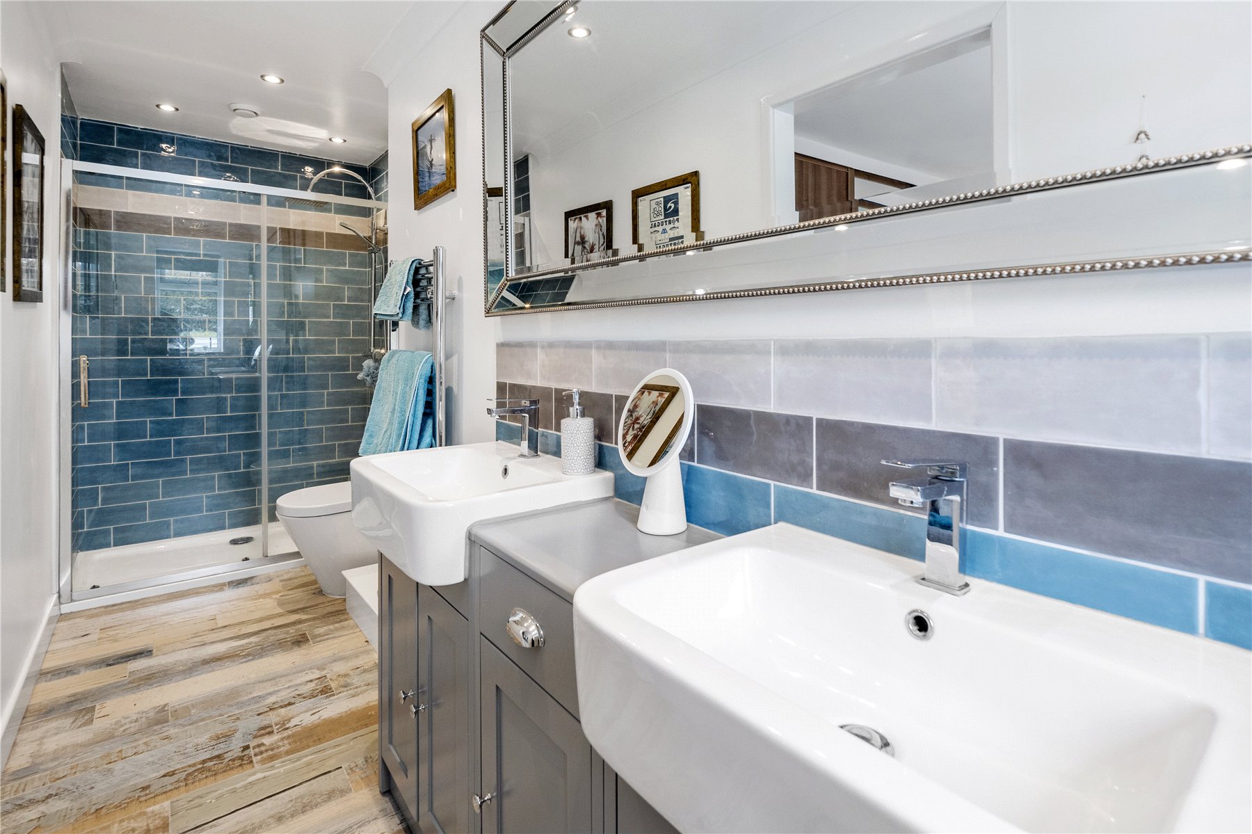 Upstairs, the PRINCIPAL BEDROOM serves as a private sanctuary with its ENSUITE SHOWER ROOM, complete with 'his and her' wash-hand basins. Each of the FOUR BEDROOMS is thoughtfully designed with built-in storage, allowing plentiful space. The FAMILY BATHROOM serves the remaining three bedrooms, offering both style and functionality.