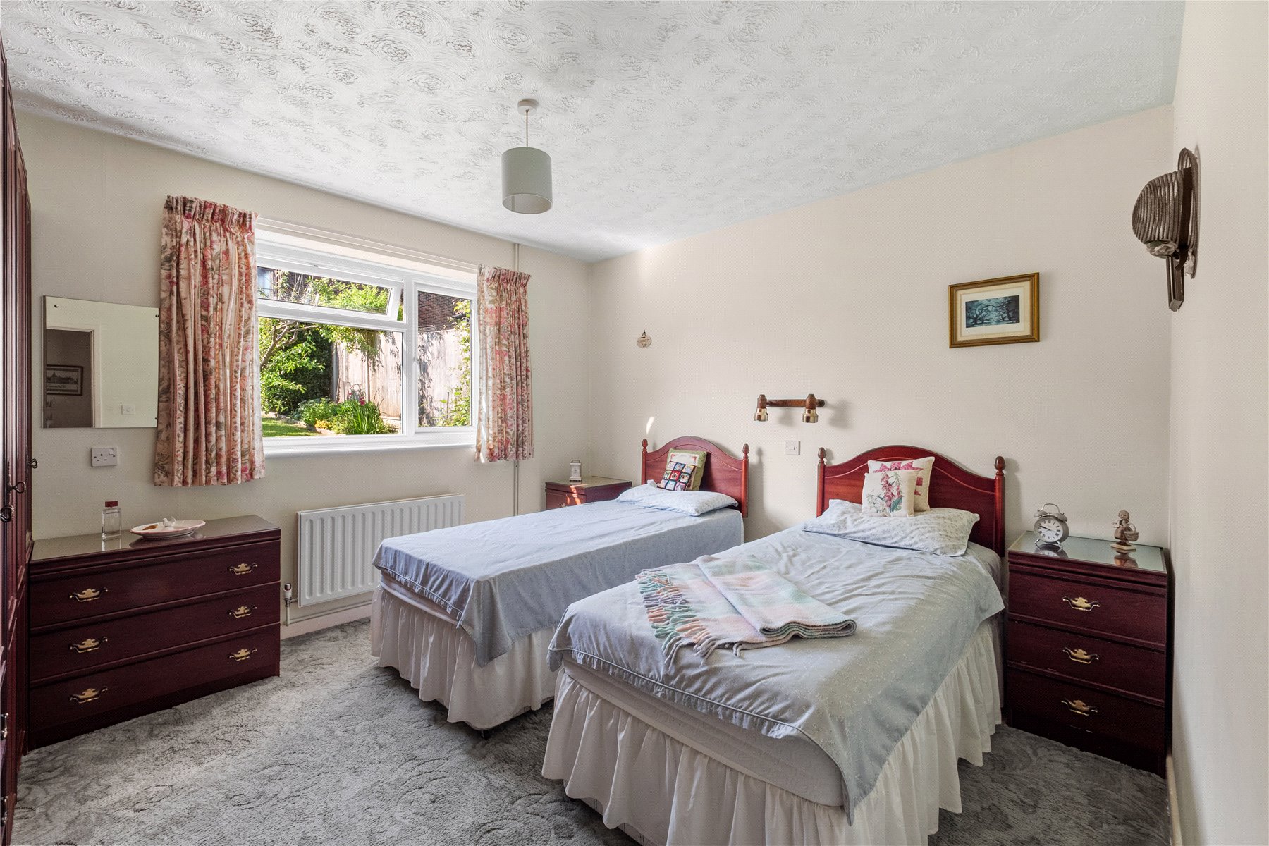 The private rear garden is a true highlight, thoughtfully landscaped with a spacious patio ideal for outdoor dining and relaxation. Surrounded by lawn, mature shrubs, hedging, and established trees, it offers a peaceful green retreat.