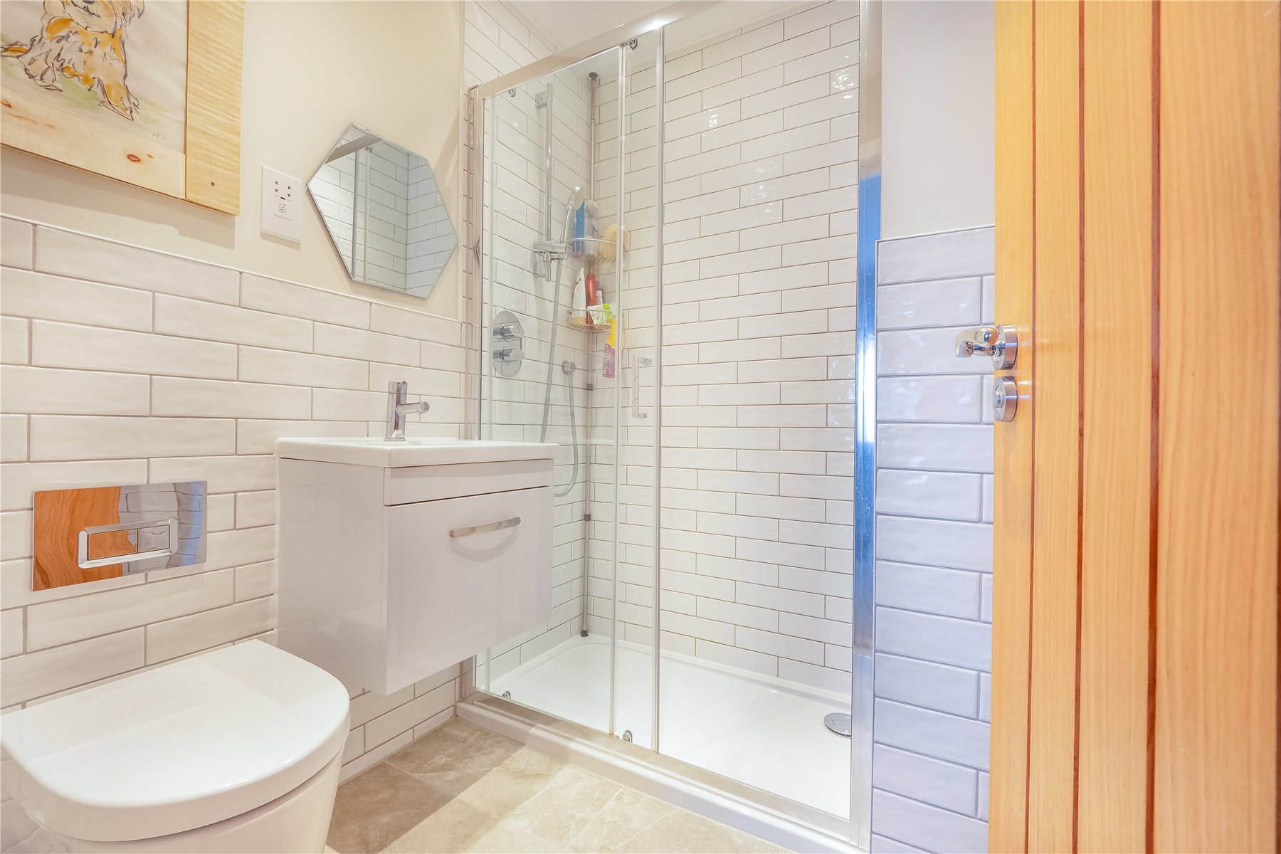 The front door opens into a welcoming ENTRANCE LOBBY, where stairs rise to the first floor. A convenient CLOAKROOM is fitted with a W.C. and wash-hand basin. Underfloor heating runs throughout the ground floor, complemented by attractive timber-effect flooring, while the first floor is served by traditional radiators and is carpeted.