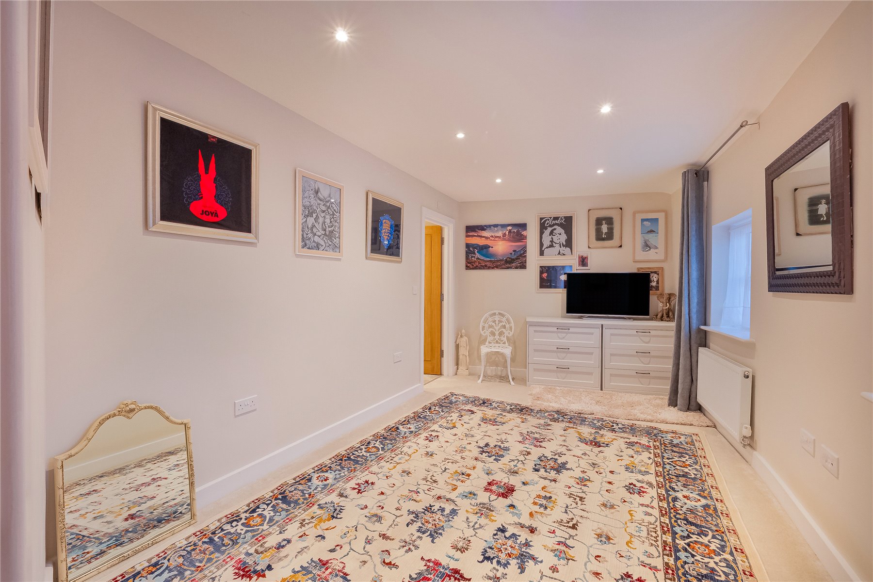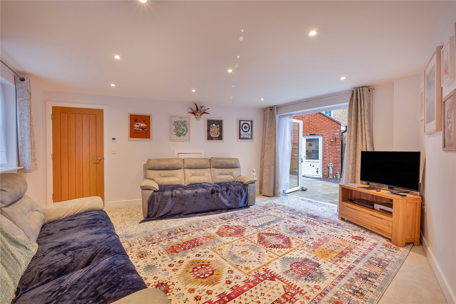 The generous SITTING ROOM is both welcoming and versatile, featuring twin windows to the front and French doors opening onto a sheltered terrace and rear garden creating an excellent space for both relaxation and entertaining. An understairs cupboard provides useful storage and houses the underfloor heating manifold.