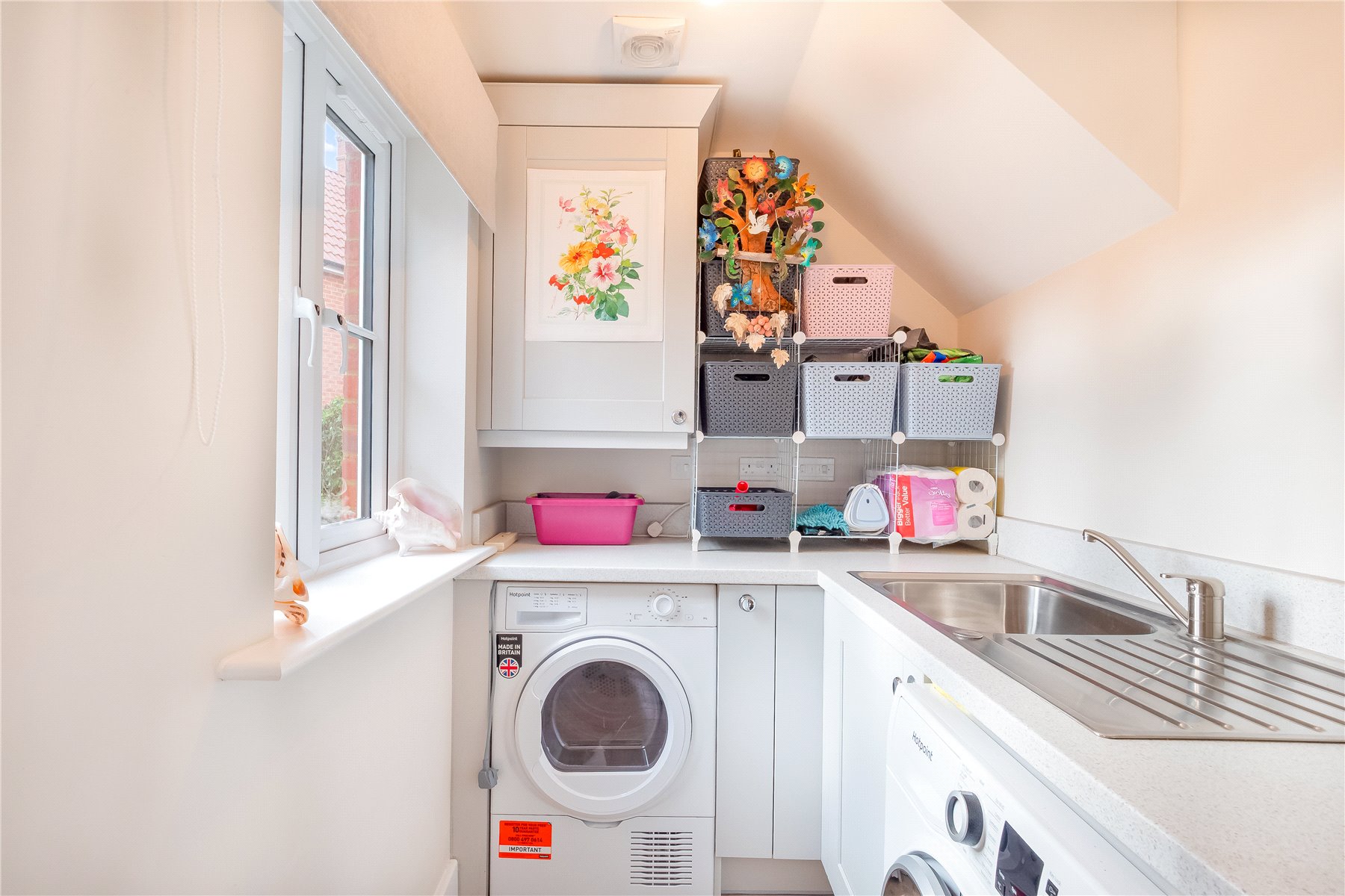 Off the kitchen, a separate UTILITY ROOM with rear window has a wall unit housing the Ideal Logic gas combi boiler, plus workspace with sink and a Hotpoint washing machine and a tumble dryer.