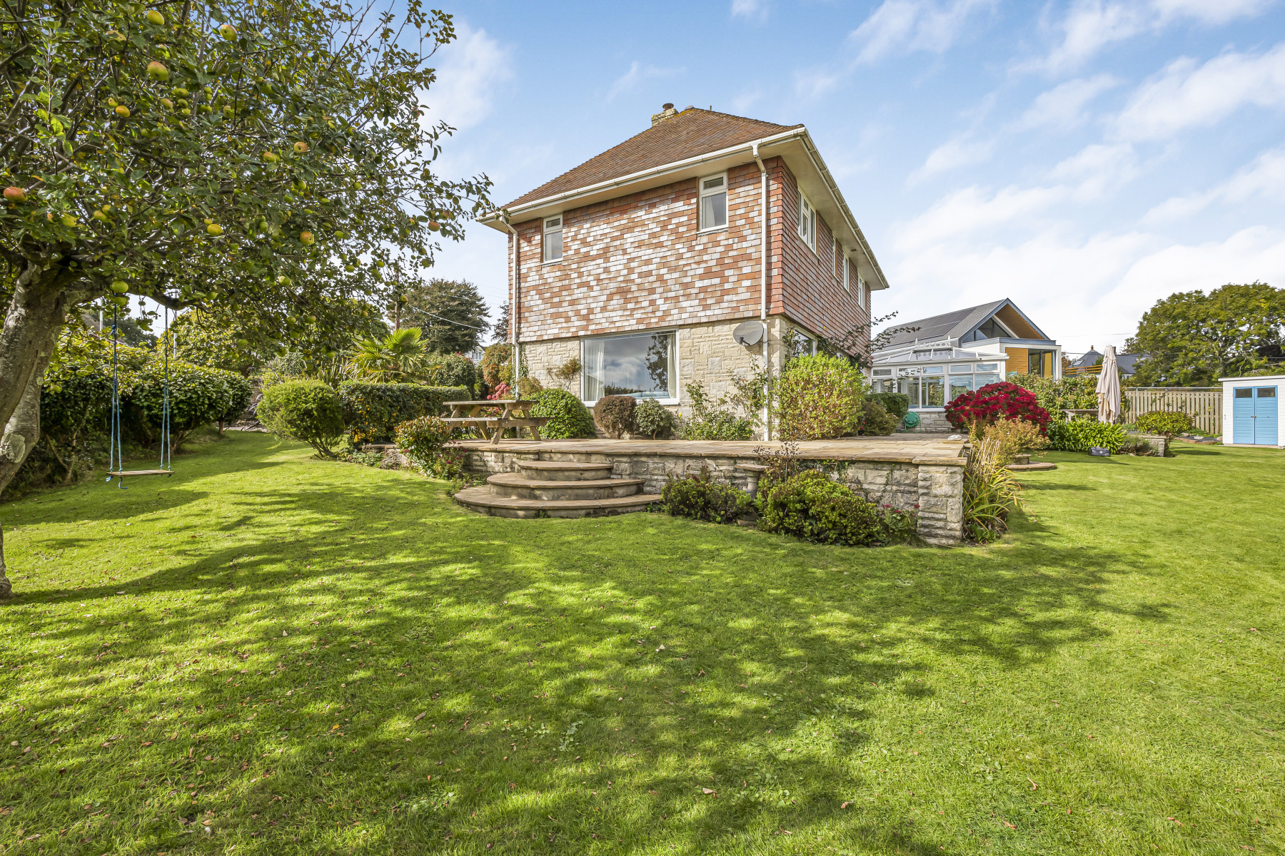 A substantial four-bedroom detached family home with sea views, landscaped gardens, a private orchard, double garage and...