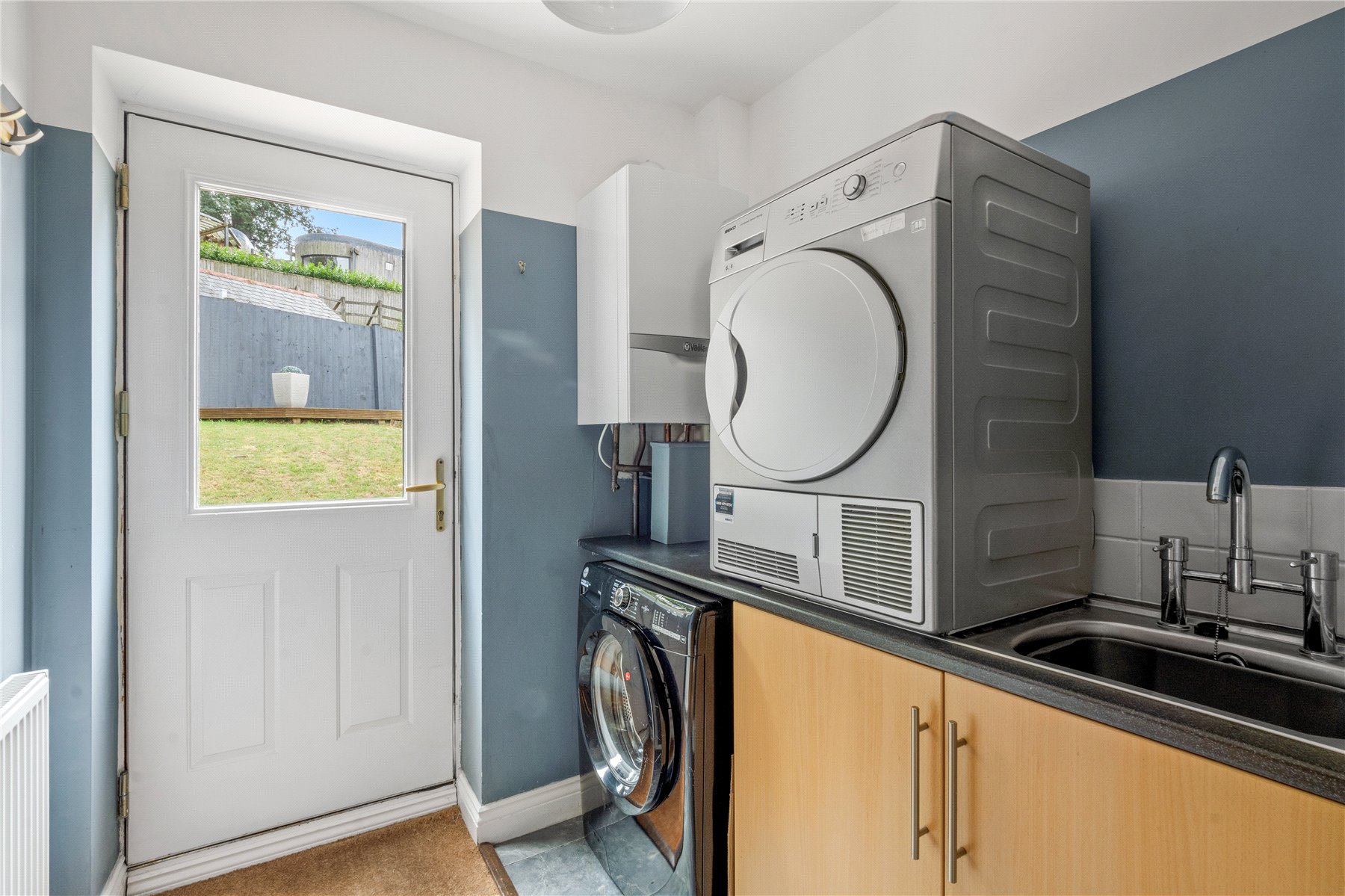 Adjoining the kitchen is a practical UTILITY ROOM, fitted with base units, a sink, and space for a washing machine. A door from the utility room provides access to the rear garden, creating a convenient flow for day-to-day use. Completing the ground floor is a modern downstairs WC, located just off the main hallway by the front door.