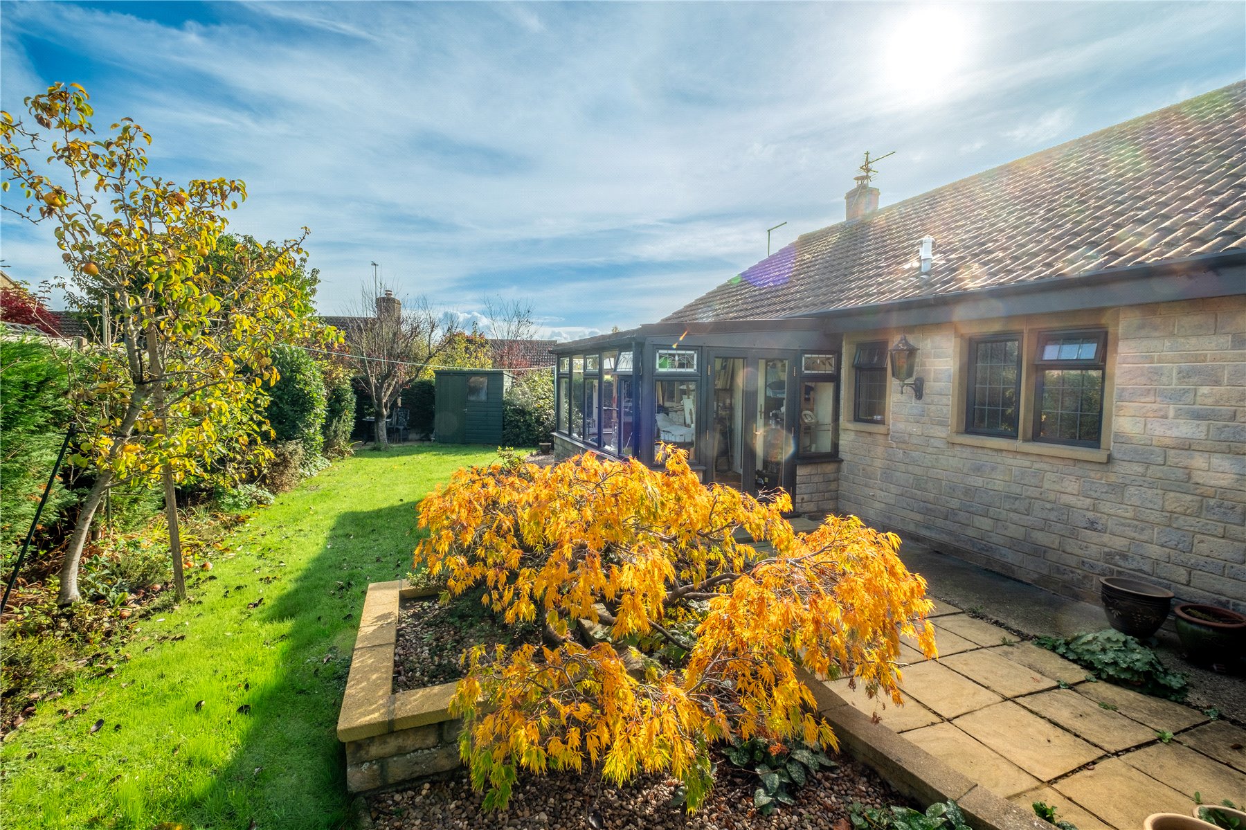 Outside, the FRONT GARDEN is neatly laid to lawn, framed by trees and pathways that lead to the front door and GARAGE, which has an electric door and houses the boiler. A side gate provides access to the rear garden.