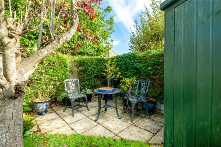 The REAR GARDEN is private and well established, with mature trees and shrubs, including a plum tree, varieties of cooking and eating apple trees, a William pear tree, and a cobnut bush. patio areas offering space to sit, relax, or enjoy outdoor dining.