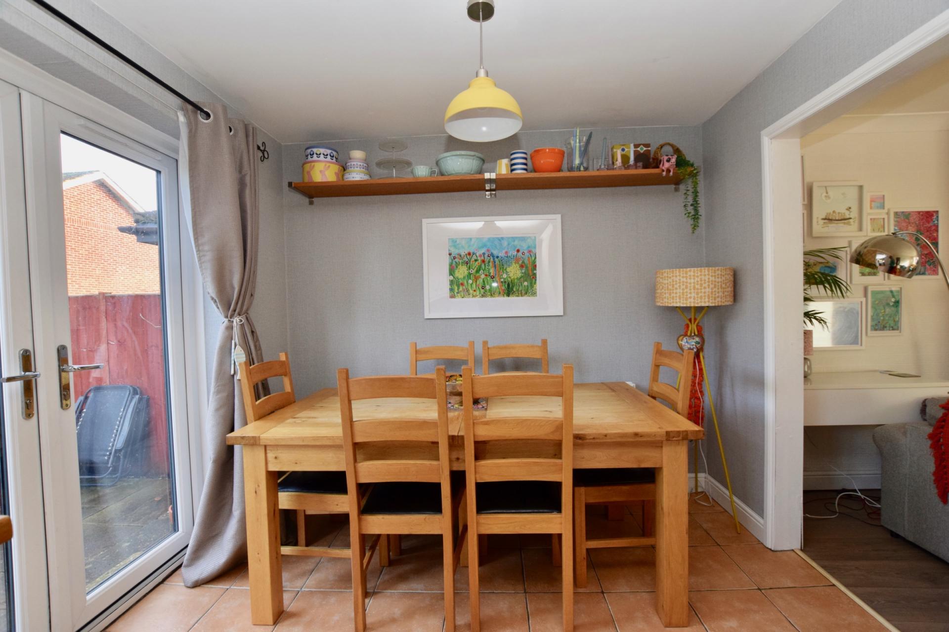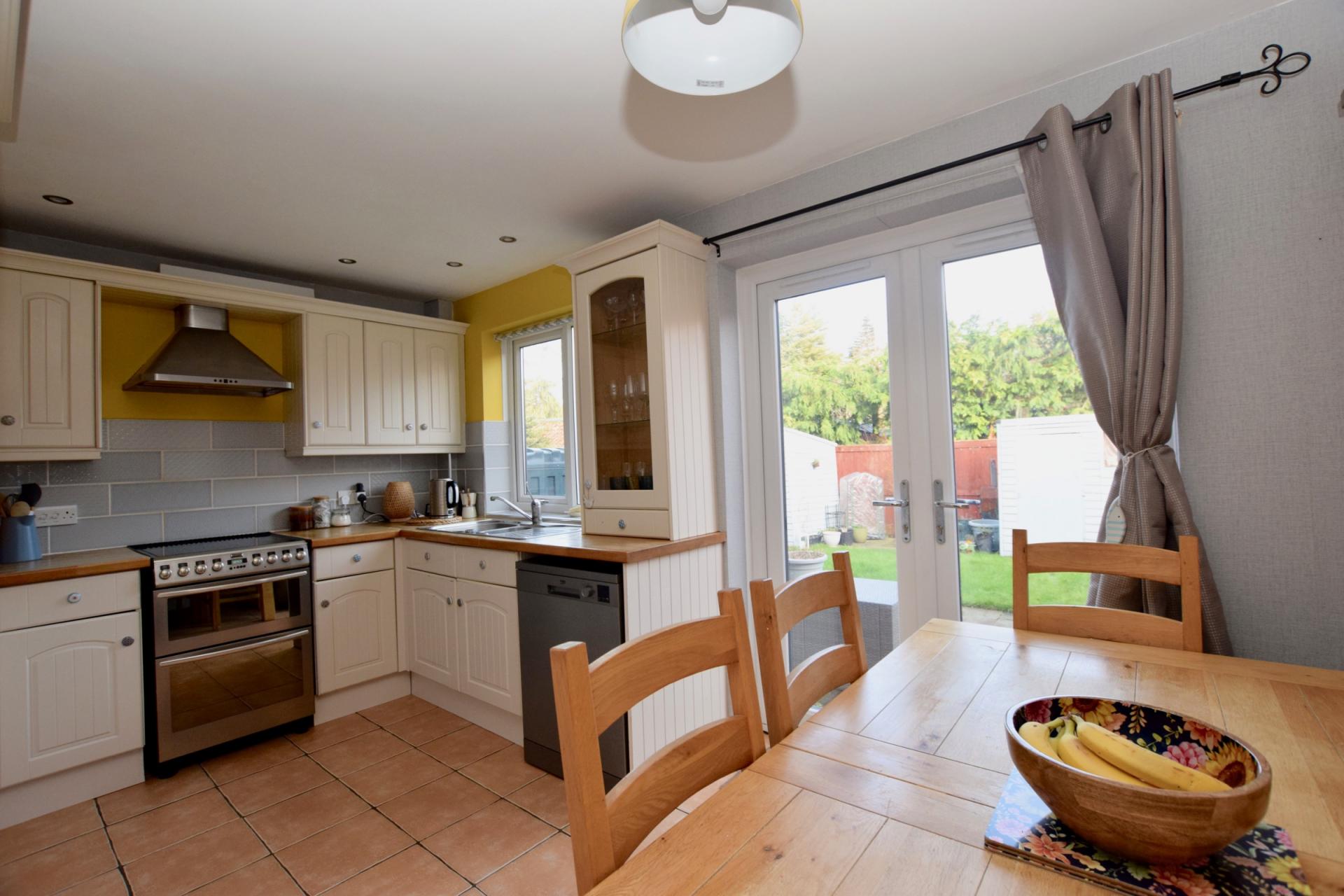 KITCHEN/DINING ROOM 8' 11" x 14' 6" (2.72m x 4.42m) Window to rear aspect, French doors to rear garden. Range of fitted wall and base units with wooden worktops, plumbing for dishwasher. Freestanding electric cooker with extractor over. Stainless steel one and a half bowl sink and drainer, tiled flooring, recessed ceiling spotlights, radiator.