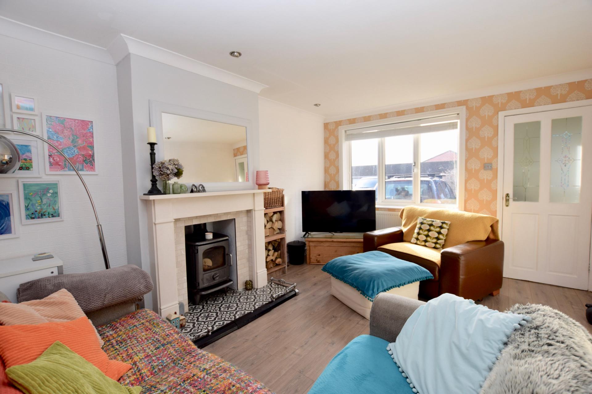 LIVING ROOM 15' 8" x 11' 3" (4.78m x 3.43m) Window to front aspect. Multi-fuel burning stove inset in surround, laminate flooring, radiator. Opening to;