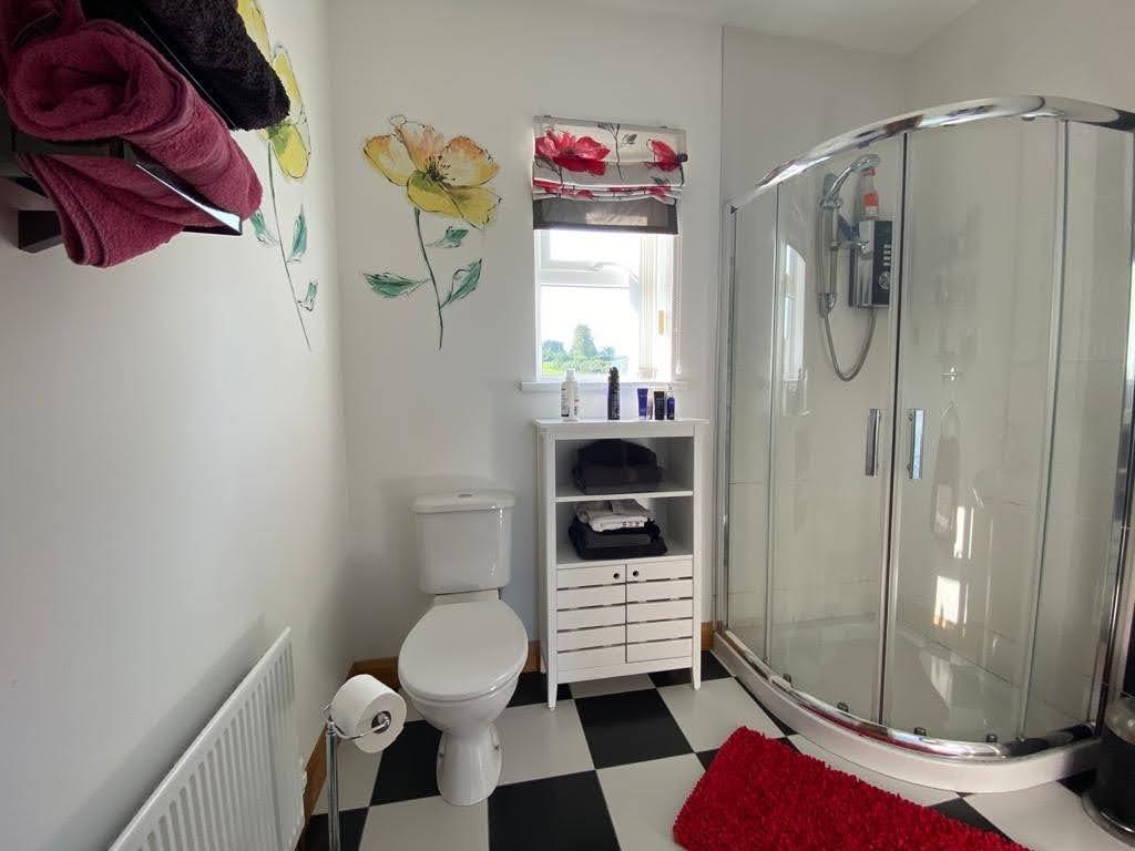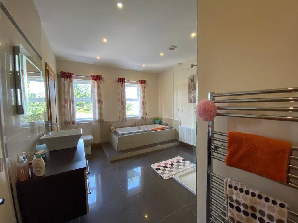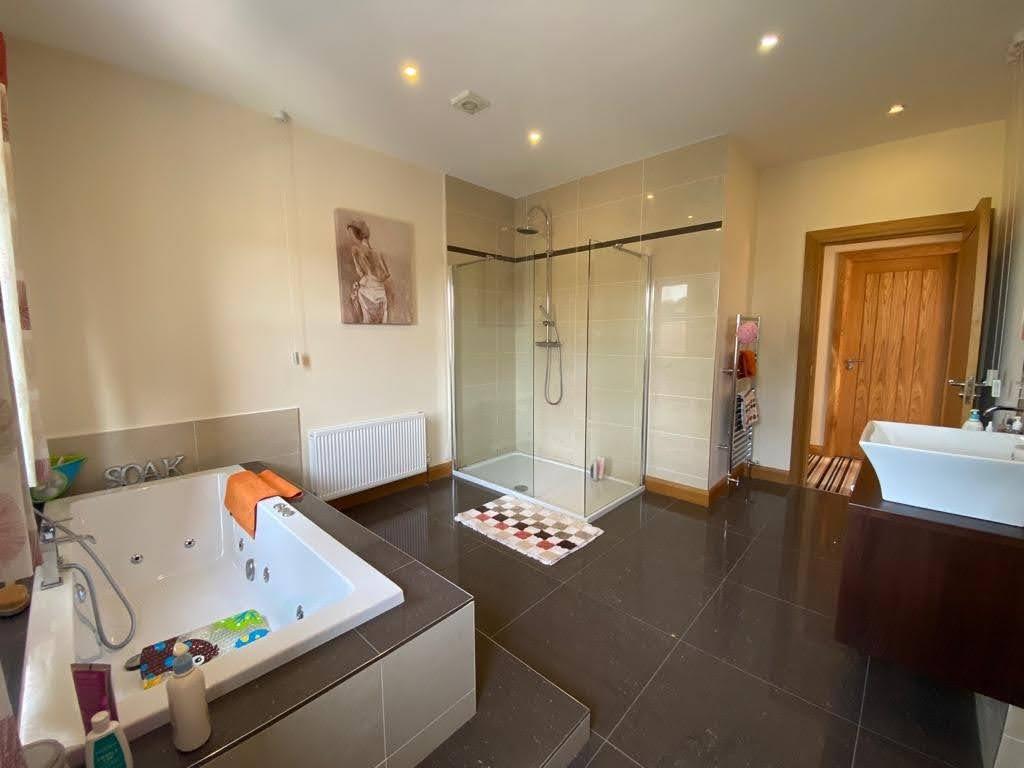 Comprising Whirlpool Jacuzzi style bath, fully tiled walk in power shower, whb set in vanity unit, mirror with sensor light, recessed lighting, chrome radiator, airing cupboard, airing cupboard.