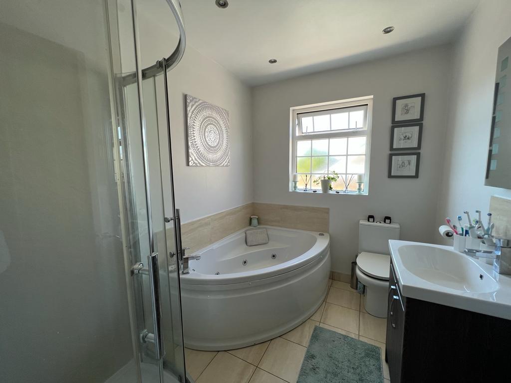 Comprising corner Jacuzzi style bath, whb set in vanity unit, walk in shower, recessed lighting, tiled floor.