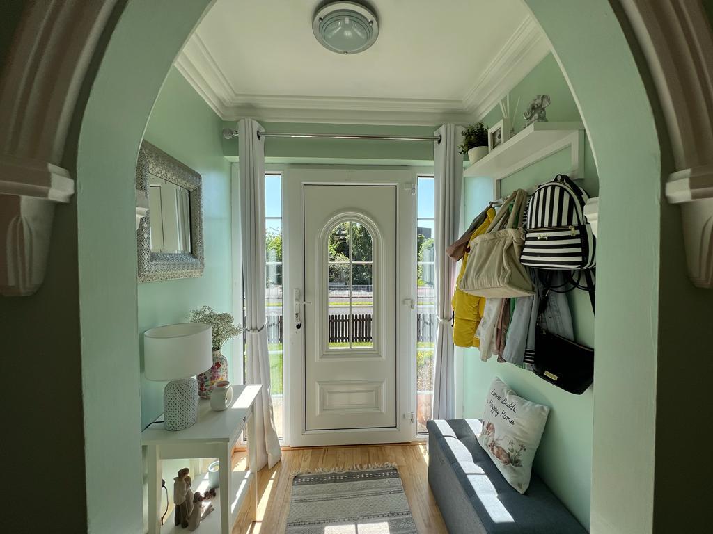 Having understairs storage, ceiling cornicing and semi-solid wooden floor.