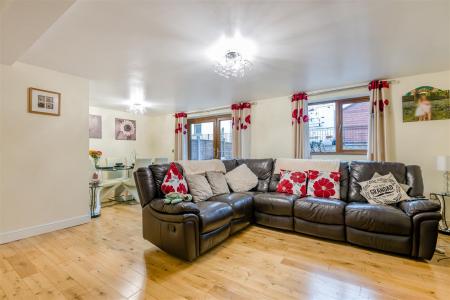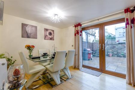 Dining Room- Continuation of the wooden flooring, power points, pair of rear aspect woodgrain upvc double glazed French doors opening onto the garden.