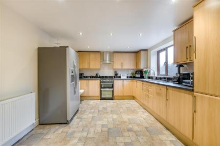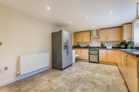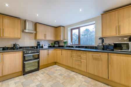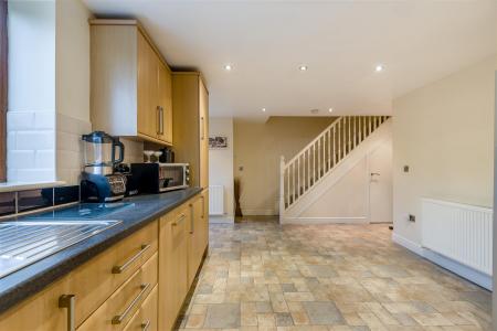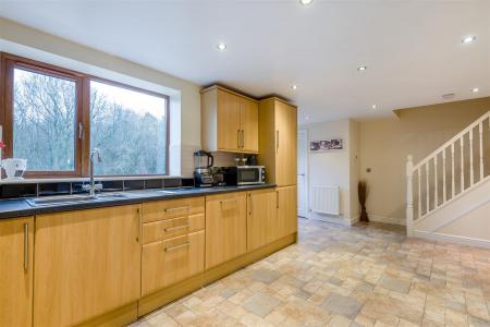 Kitchen/Breakfast Room - 6.60m x 3.35m (21'08 x 11'00) - One and a half bowl single drainer stainless steel sink unit with mixer taps over, rolled edge worktops, range of base and wall mounted units, tiled splashback, power points, space for freestanding cooker, extractor hood over, gas fired central heating and domestic hot water boiler, integrated dishwasher and washing machine, ceiling spots, double radiator, single radiator, wood laminate tiled effect flooring, stairs leading to the first floor, central heating thermostat controls, wooden panel door giving access into a store cupboard with hanging and shelving space, door to understairs storage cupboard, front aspect wood grain upvc double glazed window with views overlooking the garden and towards forest and woodland, wooden panel door giving access into the Cloakroom and Lounge