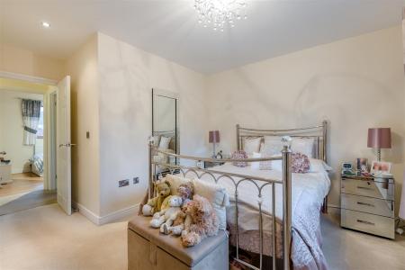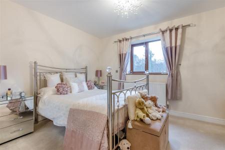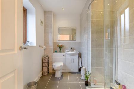 Ensuite - 2.74m x 2.08m (9'00 x 6'10) - Inset ceiling spots, white suite with concealed cistern w.c, vanity wash hand basin, monobloc mixer tap over, cupboard beneath, fully tiled walk-in shower cubicle with mains fed drencher head, tiled flooring, chrome heated towel radiator, inset ceiling spots, extractor fan, front aspect upvc double glazed window with views towards forest and woodland
