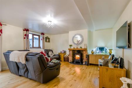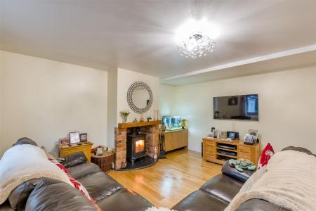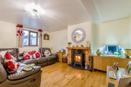 Lounge/Dining Room - 6.63m x 4.65m narrowing to 2.69m (21'09 x 15'03 na - Lounge- Feature brick fireplace with marble hearth, woodburning stove inset, wooden mantle, alcoves to either side, two ceiling lights, wooden flooring, power points, tv point, double radiator, rear aspect woodgrain upvc double glazed window overlooking the rear garden.