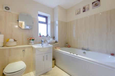 Family Bathroom - 2.34m x 2.08m (7'08 x 6'10) - Whire suite with concealed cistern w.c, vanity wash hand basin with monobloc mixer tap over, cupboard beneath, jacuzzi style bath with centre taps, three quarter tiled walls to three sides, chrome radiator, tiled flooring, inset ceiling spots, extractor fan, side aspect woodgrain upvc obscure double glazed window.