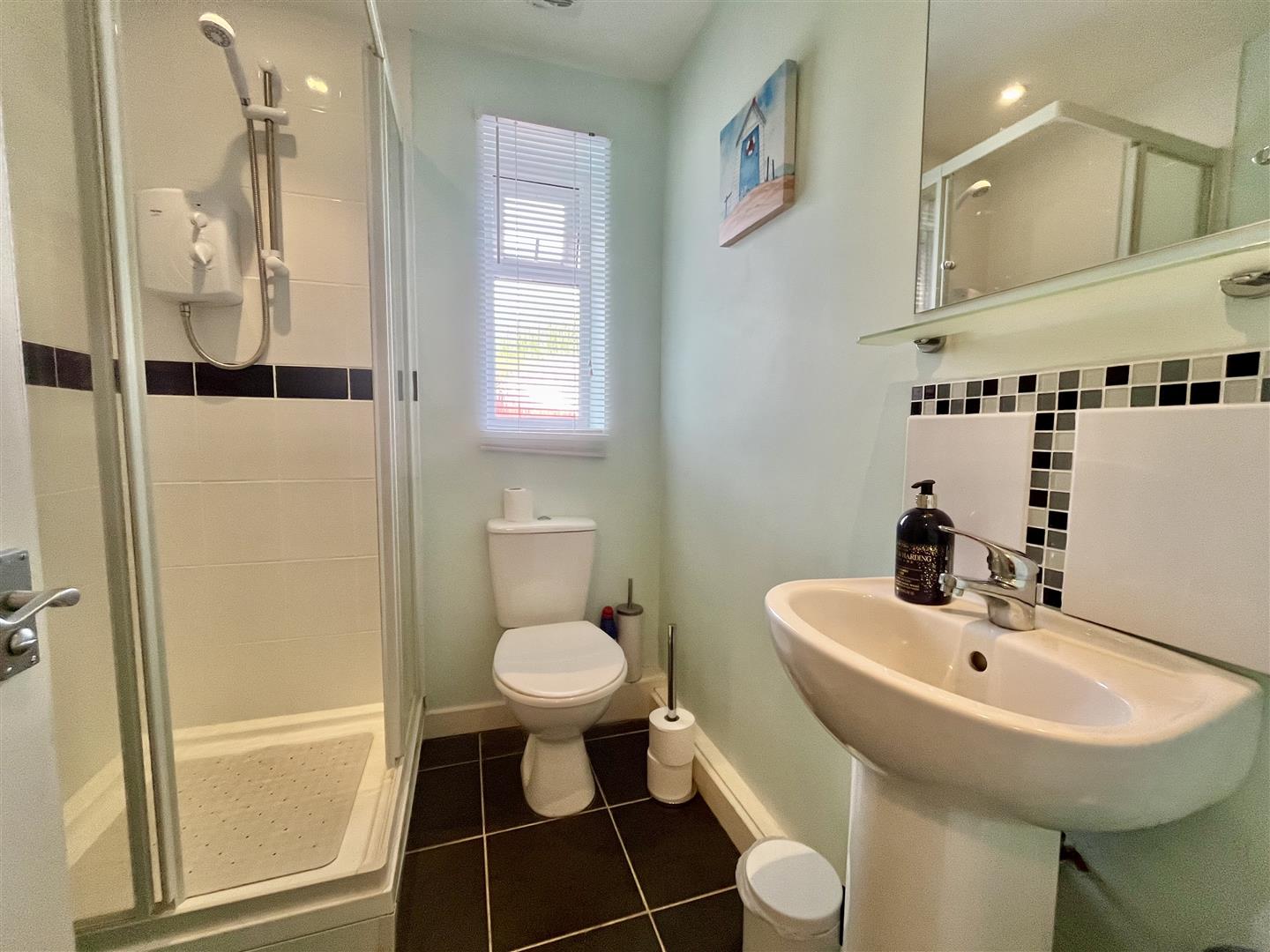 Ensuite Shower Room - 3.00m x 1.09m (9'10 x 3'07) - Walk-in shower cubicle with electric shower and tiled surround, low level w.c, pedestal washbasin with tiled splashbacks, heated towel rail, obscured side aspect window.