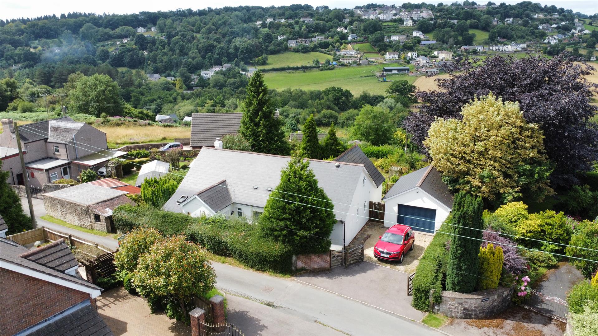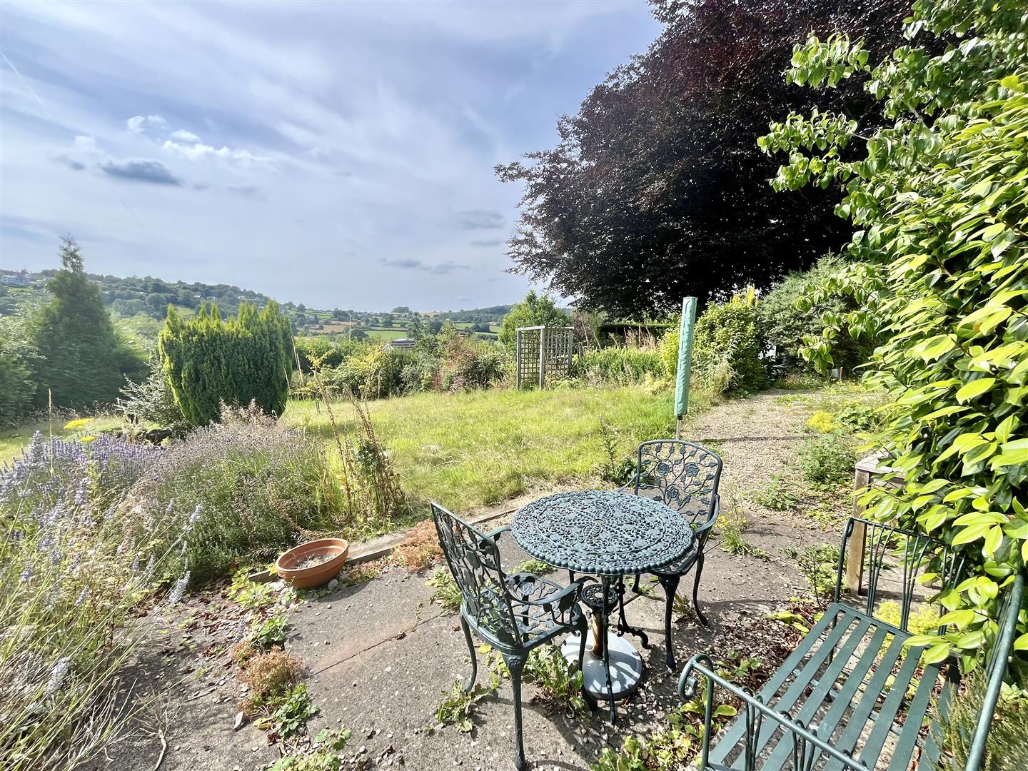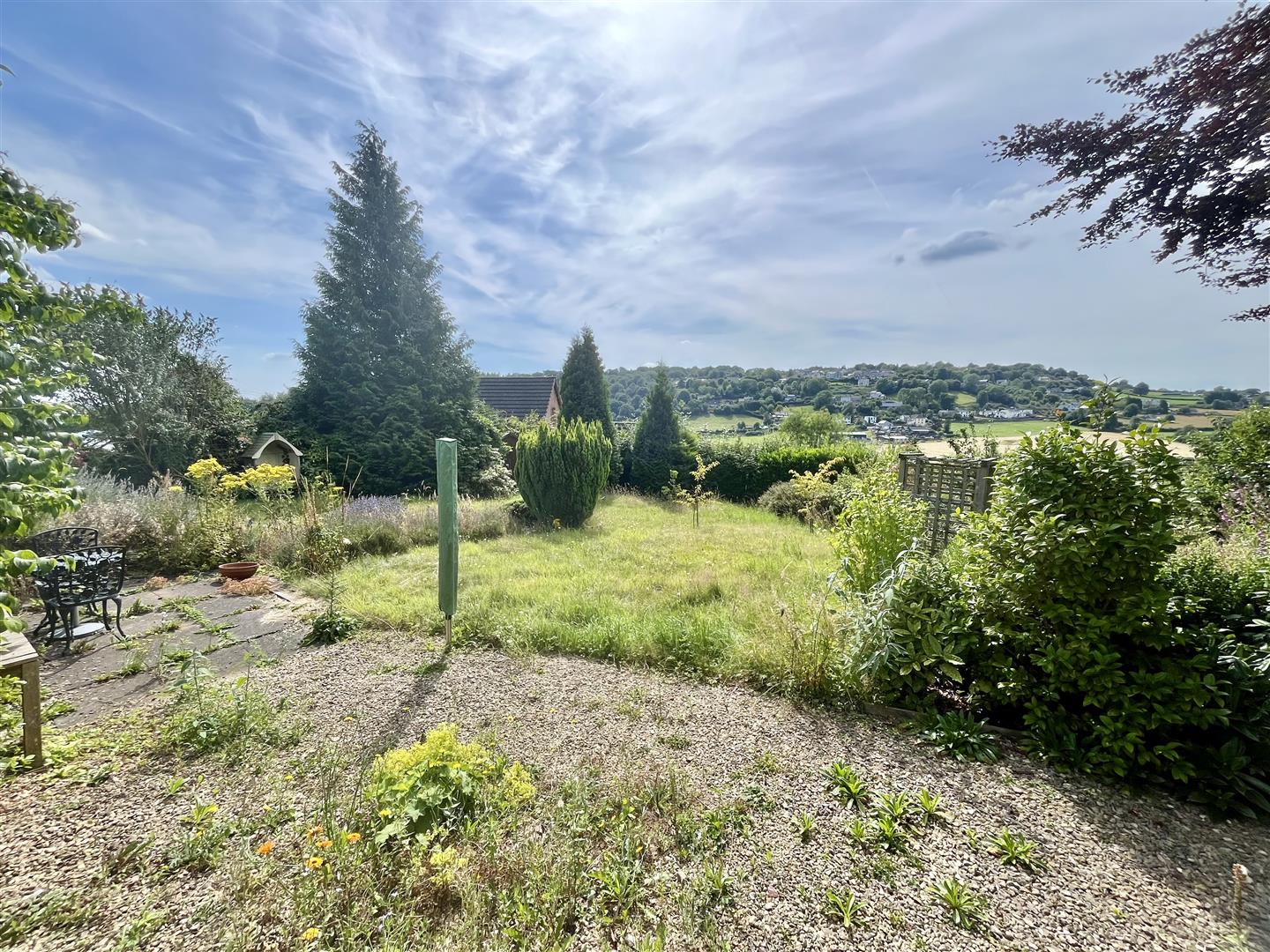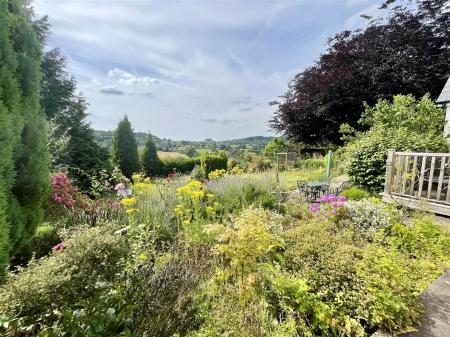 The spacious west-facing rear garden is a sun-soaked haven, perfect for growing fruit and vegetables or simply relaxing in privacy. It features inviting seating areas, mature trees, vibrant flowers, and offers stunning views of Ruardean Hill.