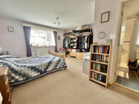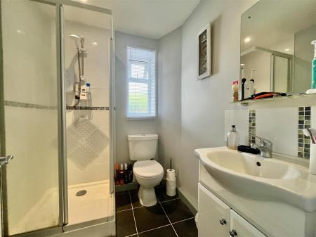 Ensuite Shower Room - 1.85m x 1.68m (6'01 x 5'06) - Walk-in shower cubicle with electric shower and tiled surround, low level w.c, vanity washbasin with tiled splashbacks, heated towel rail, tiled floor with underfloor heating, side aspect obscured window.