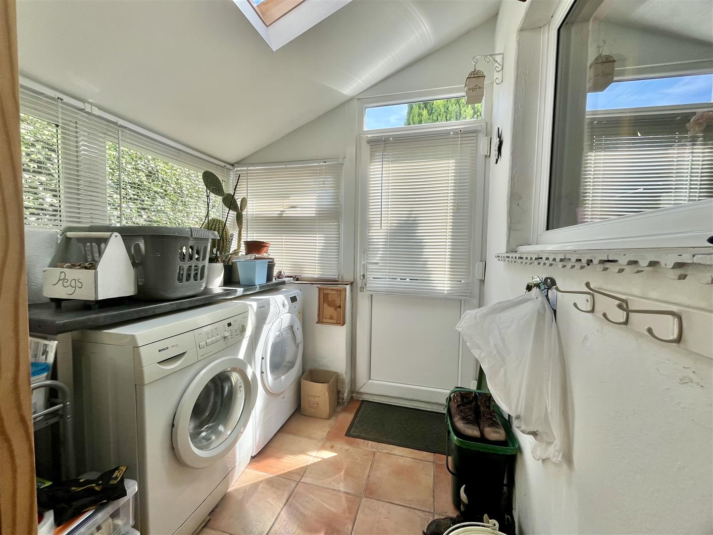 Utility - 2.06m x 1.93m (6'09 x 6'04) - Fitted laminate worktop with space and plumbing below for washing machine and tumble dryer. Wall mounted handbasin with tiled splash-backs, tiled floor, dual aspect windows, skylight, side aspect upvc door.