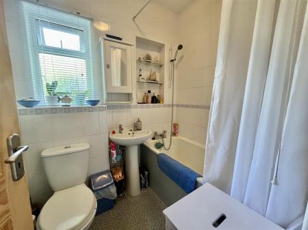 Bathroom - 1.96m x 1.65m (6'05 x 5'05) - Three piece suite comprising a bath with tiled surround, low level w.c, pedestal handbasin, radiator, obscured front aspect window.