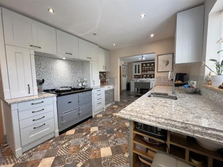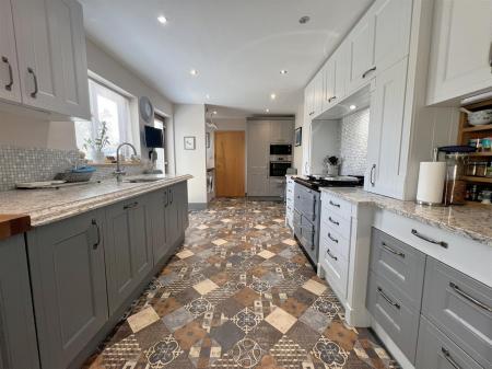 Kitchen/Breakfast Room - 5.69m x 3.07m (18'08 x 10'01) - One and a half bowl stainless steel sink unit with boiling hot water tap, quartz worktops with in-built drainer inset, range of base and wall mounted units, tiled surrounds, inset ceiling spots, space for a 1000mm Oven/Range/AGA, under-cupboard lighting, built-in conventional oven & microwave oven, utility area with woodblock worktop, space for washing machine and tumble dryer, gas fired Worcester domestic hot water and heating boiler, power points, rear aspect upvc woodgrain double glazed window and door overlooking the rear garden, timber door giving access into: