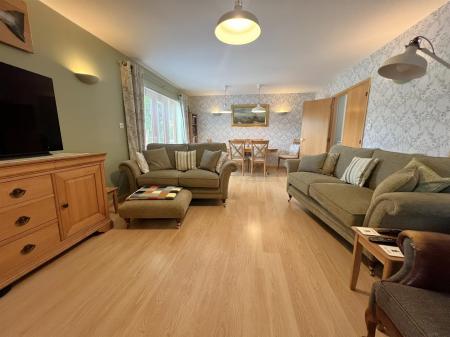 Lounge/Dining Room - 5.99m x 3.99m (19'08 x 13'01) - Ceiling lights, wall light points, exposed timber skirting boards, wood laminate flooring, power points, tv point, double radiator, door to understairs storage cupboard, dimmer switches, front aspect woodgrain upvc double glazed French doors with glazed panels to either side opening onto the front garden with views towards Ruardean Hill, pair of wooden double doors opening into: