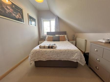 Bedroom Two - 3.18m x 2.62m (10'05 x 8'07) - Vaulted ceiling with ceiling light, single radiator, power points, access to eaves storage, door to built-in storage cupboard with hanging rail, exposed timber skirting boards, double wardrobe, timber window ledge, side aspect upvc double glazed window.