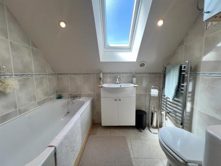 Family Bathroom - 1.98m x 1.47m (6'06 x 4'10) - White suite with close couple w.c, vanity wash hand basin with cupboards beneath, mixer tap over, modern side panel bath with mains fed shower fitted over, ceiling spots, chrome heated towel radiator, fully tiled walls and flooring, front aspect obscure Velux roof light.