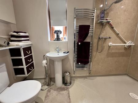 Wet Room - White suite with close coupled w.c, pedestal wash hand basin with tiled splashback, taps over, wetroom shower area with aqua board surround, mains fed shower, non slip flooring, inset ceiling spots, extractor fan, heated towel radiator, side aspect obscure upvc double glazed window.