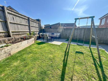The rear garden is laid to patio and lawn, providing various areas for entertaining. Raised flower borders are planted with shrubs and bushes, all enclosed by fencing. Additional benefits include outside lighting, an outside tap, and rear access to the garage via a personal door.
