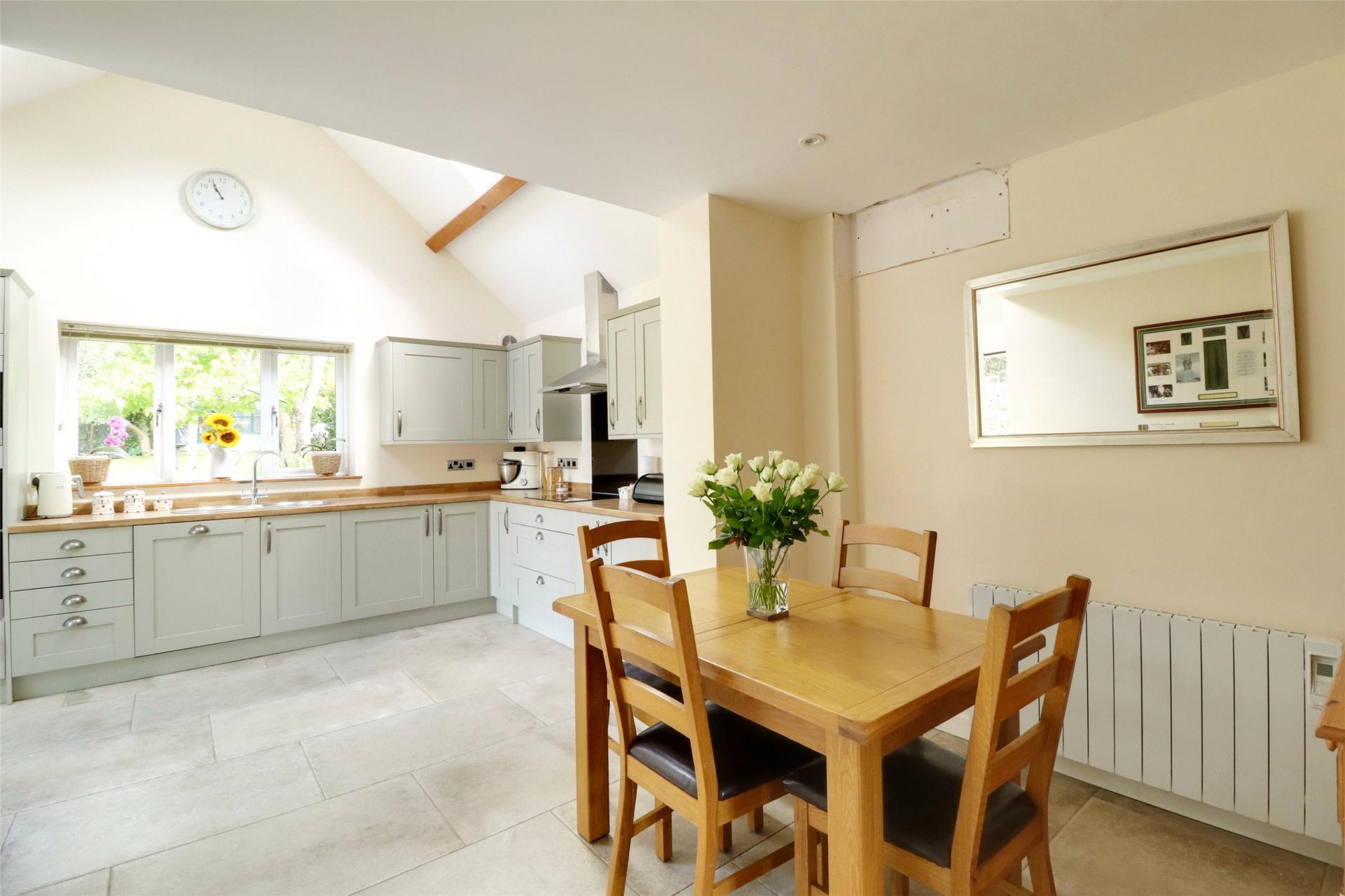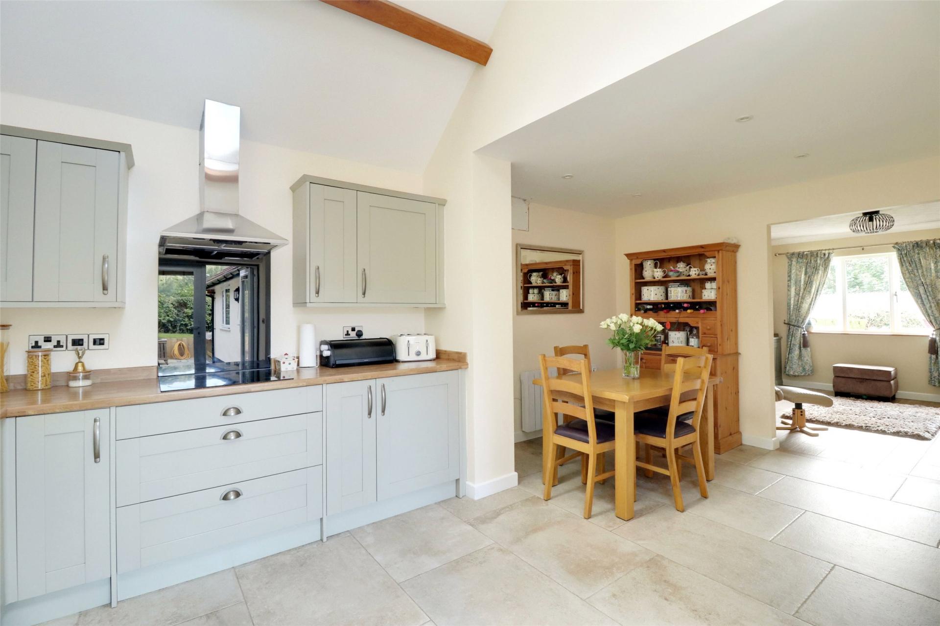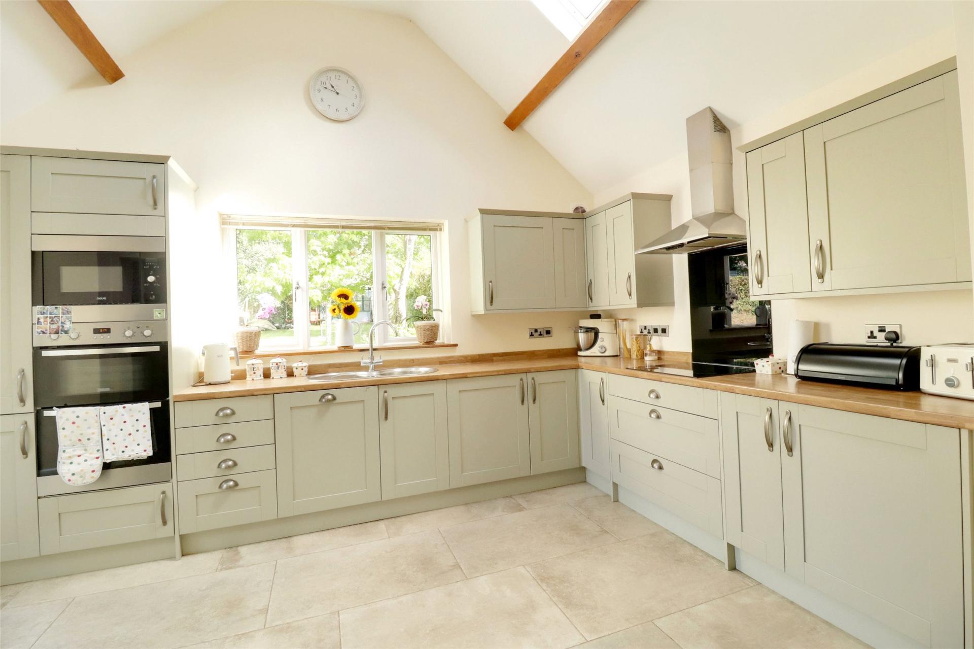 Continuing on the ground floor the sitting room benefits from inset woodburning stove, views to the front elevation and access to the large open plan “L” Shaped Kitchen/Dining room. The kitchen is part vaulted ceiling with windows overlooking the rear garden and double doors onto gardens and paved patio.