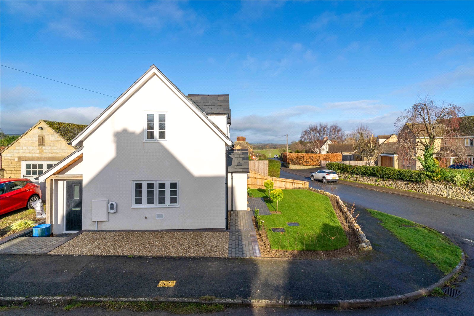 The cottage has a parking space to the side with electric vehicle charger. There is a garden to the front of the property behind a stone retaining wall with lovely views over the village street. A hornbeam hedge has been planted for privacy and screening which will mature over time with clipped lollipop trees either side of the front door.