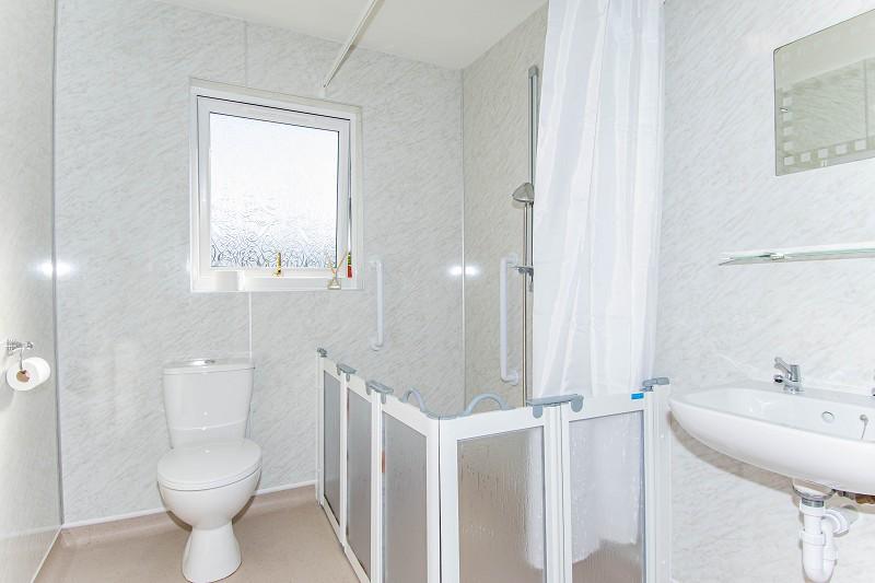 This immaculately presented room has been fitted throughout with wet-wall and benefits from non-slip flooring. There is a walk-in shower, wall-mounted basin as well as a W.C. There is a central heating radiator, an extractor fan and a flush light fitting as well as a shaver light. An opaque window faces the rear elevation. There is a wall mounted mirror with glass shelf as well as a chrome towel holder.