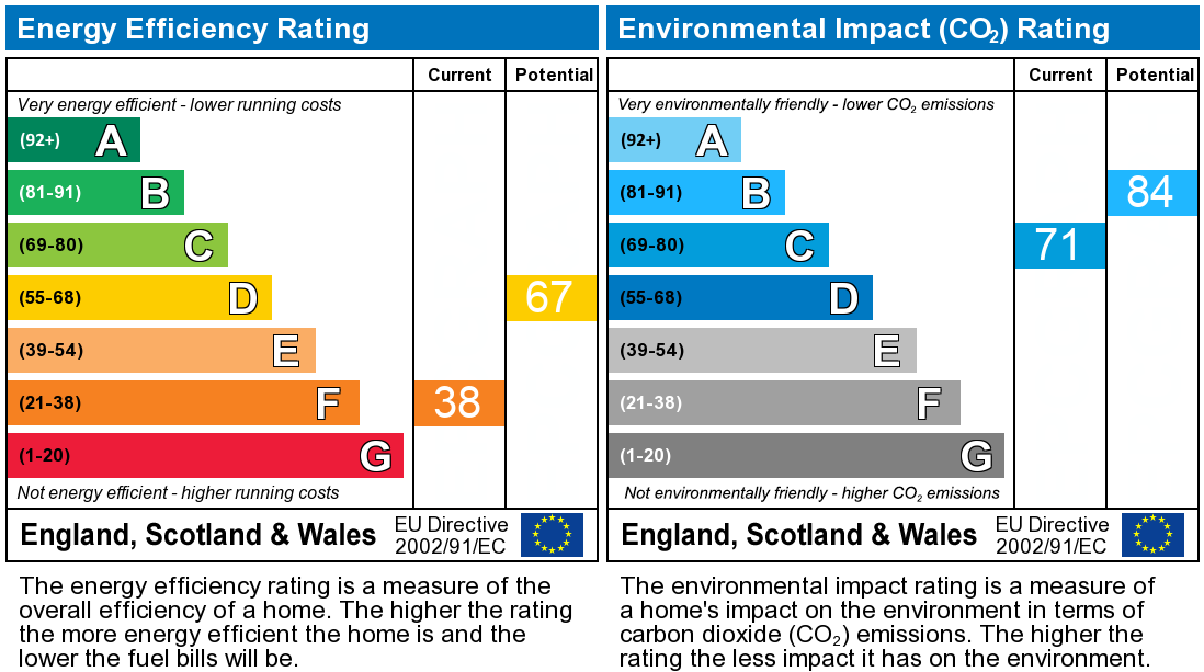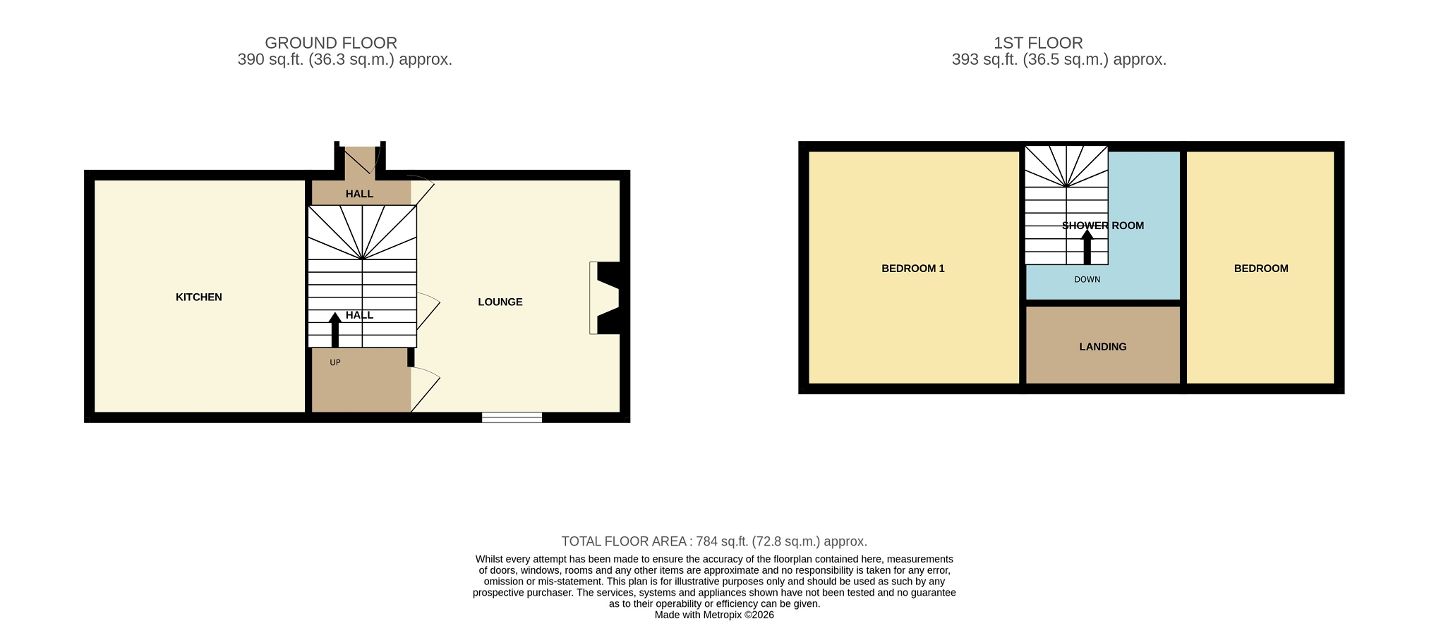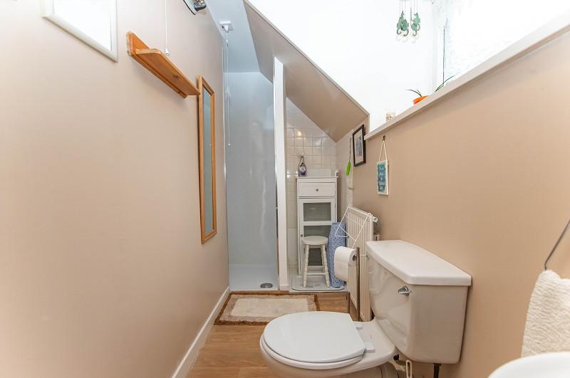 Upstairs, the landing leads to two well-proportioned double bedrooms, both front facing and neutrally decorated. The spacious shower room is fitted with a recessed shower, WC and pedestal basin, and also houses the hot water tank, offering practical storage.
