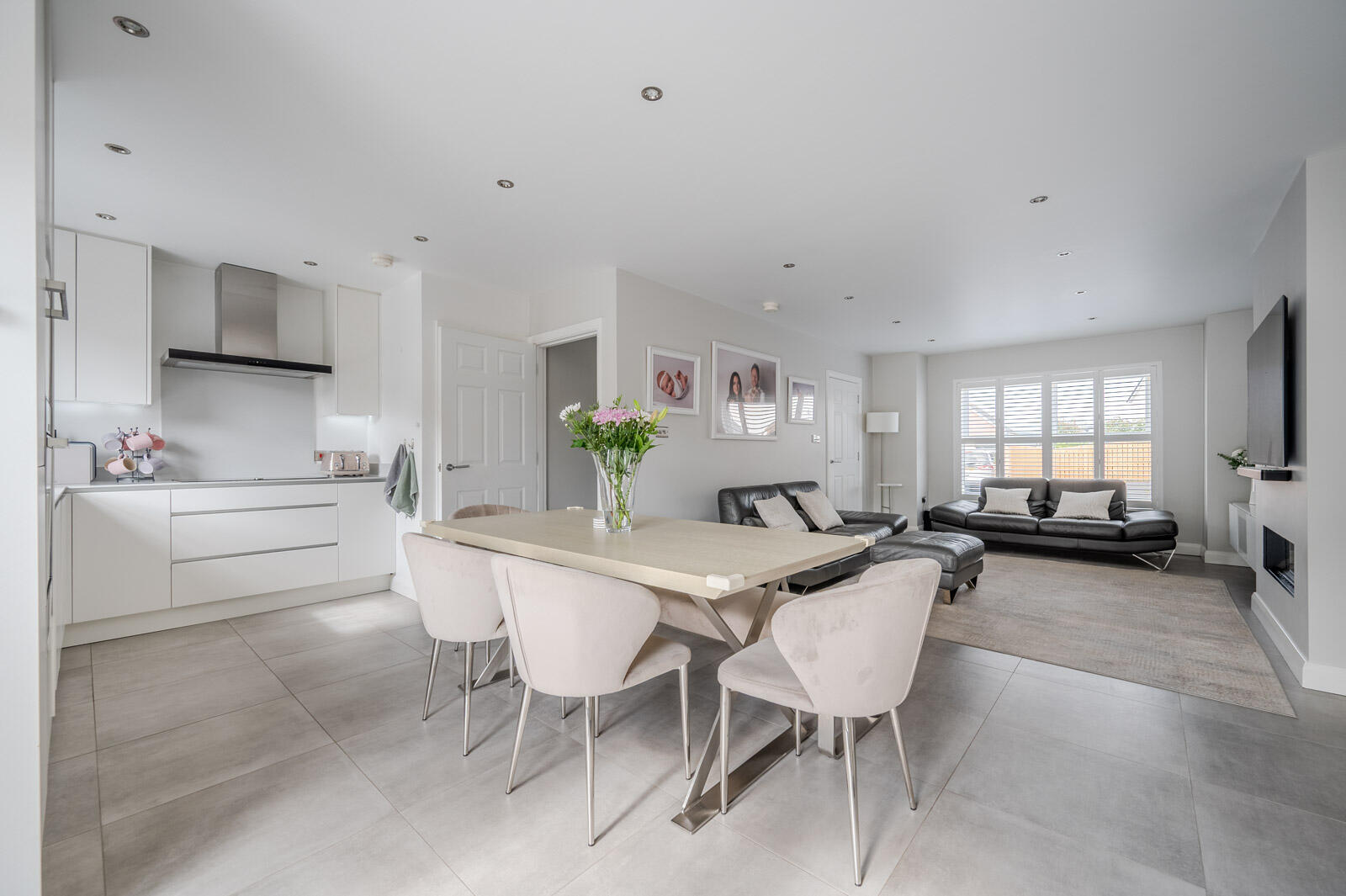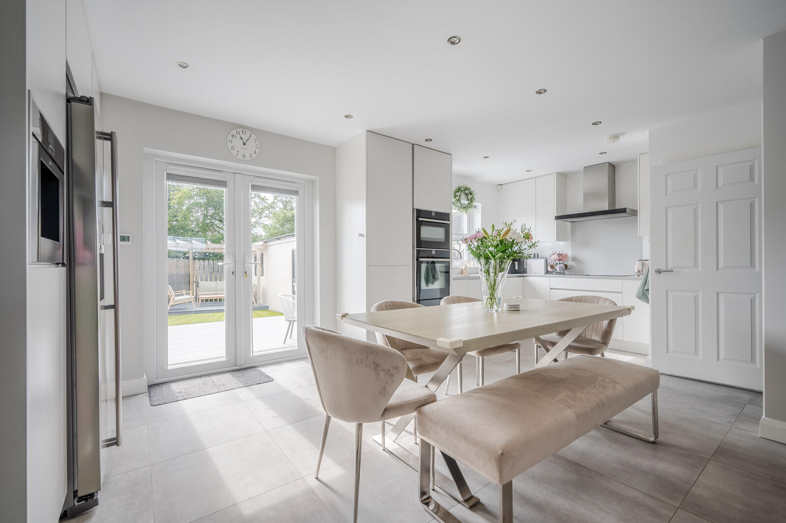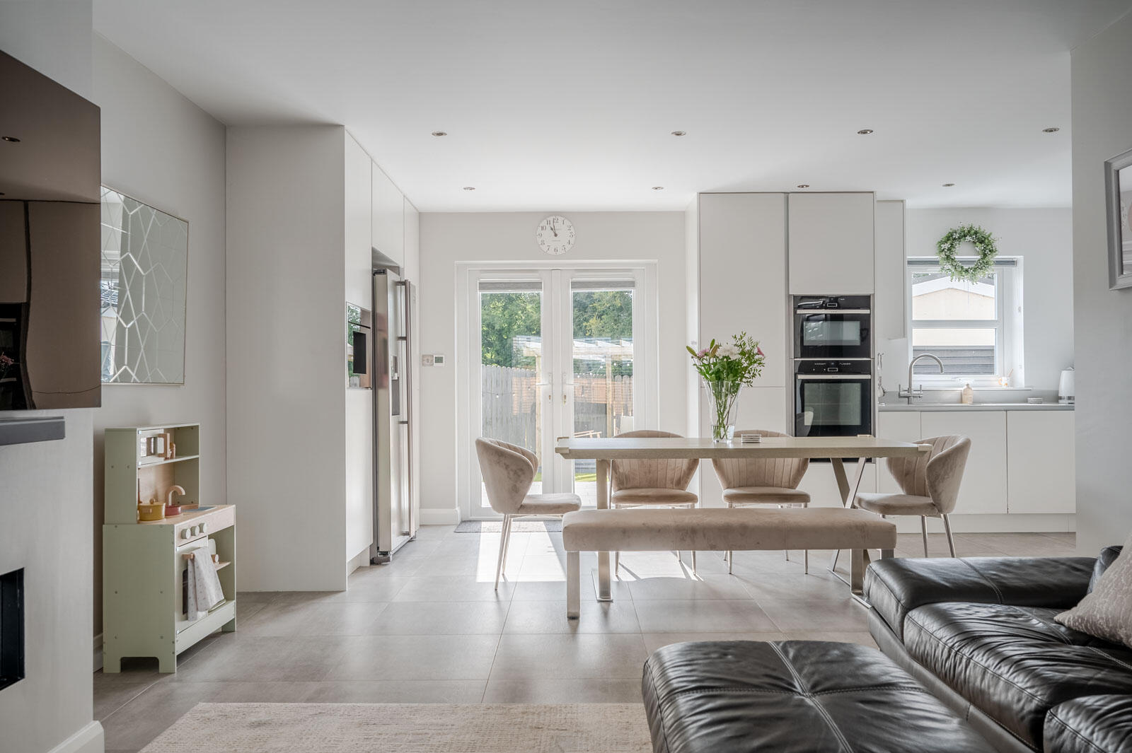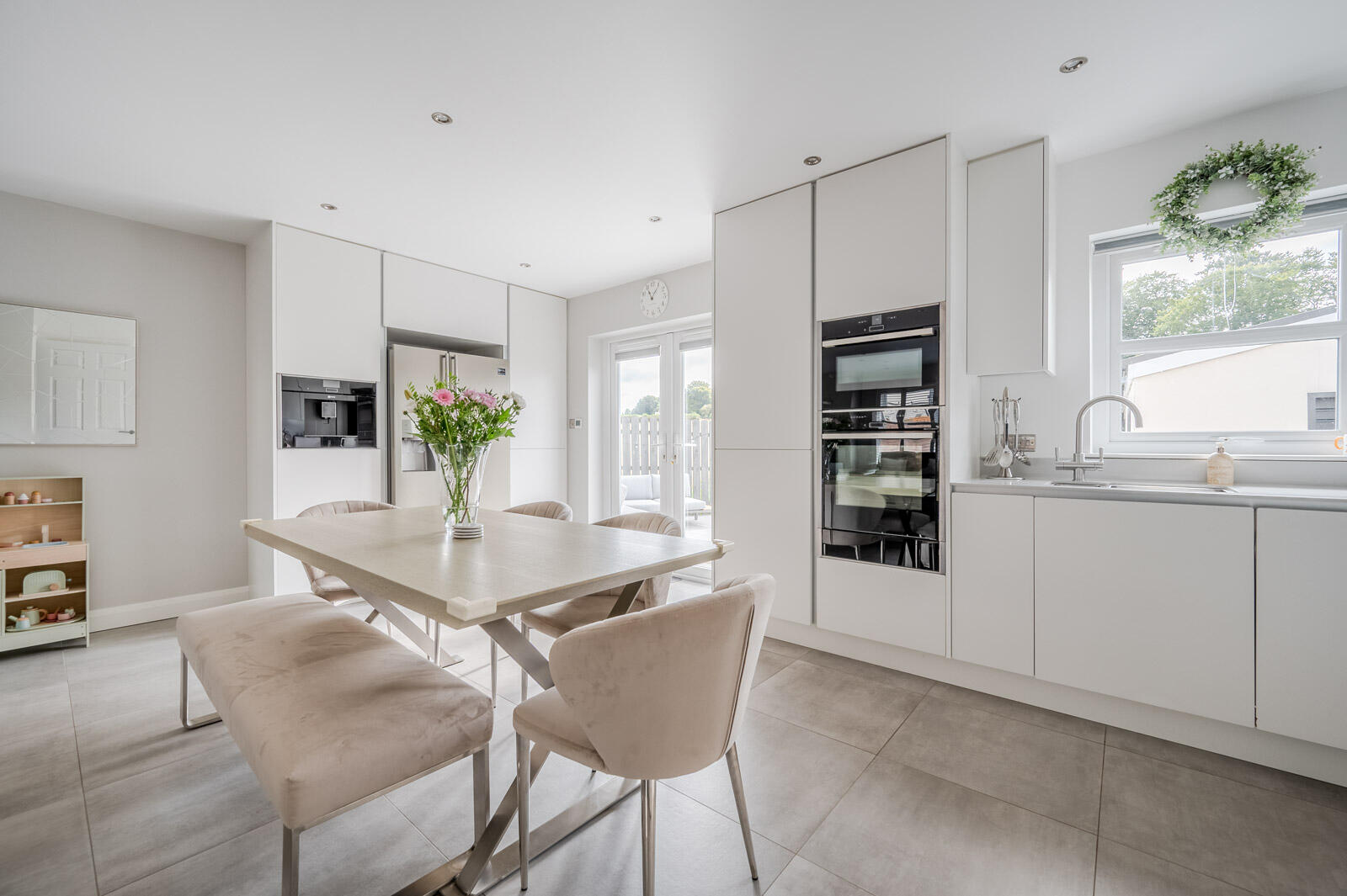 Kitchen/Dining - 6.12m x 3.18m (20'1 x 10'5) - Fully fitted handleless kitchen with range of high and low level units, five ring hob, Corian composite counter with 1 piece splashback, splashback and sills, integrated dishwasher, stainless steel sink and a half with chrome mixer tap and boiling tap, integrated dual oven, space for American style fridge freezer, integrated Neff coffee machine, pantry under stairs, inset low voltage LED spotlights.