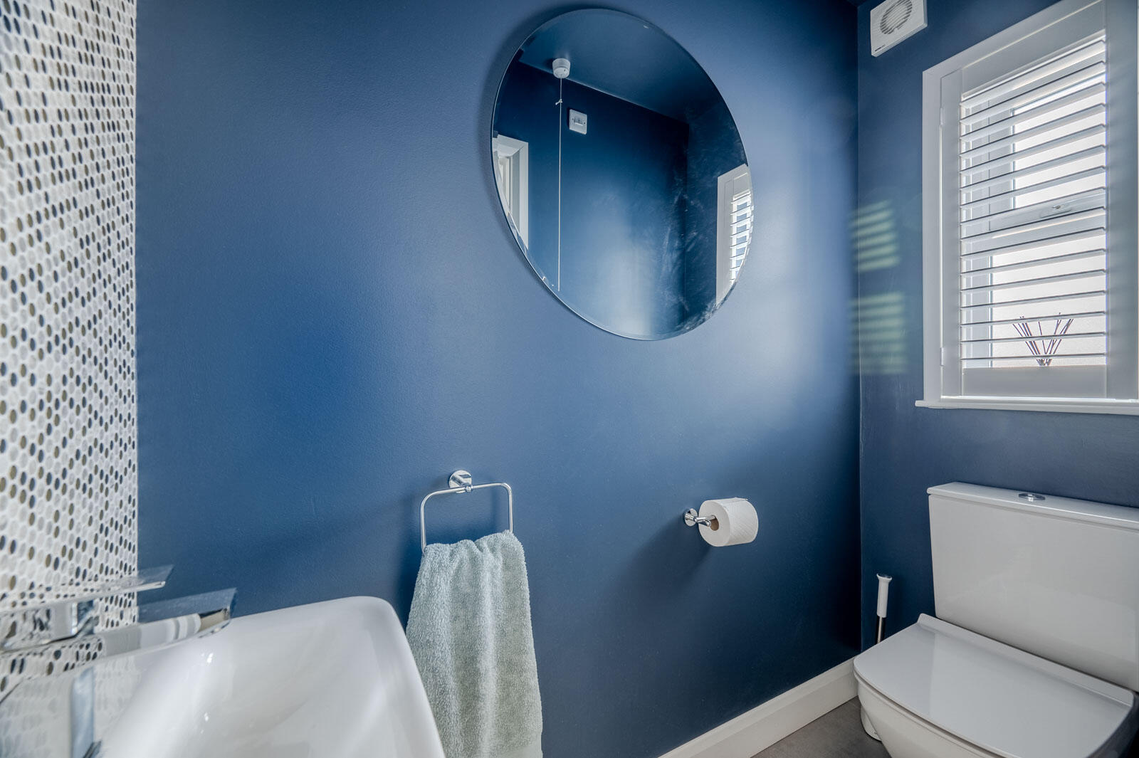 Downstairs Wc - With low flush WC, wall hung wash hand basin, chrome mixer tap, feature polka dot tiled wall, extractor fan.