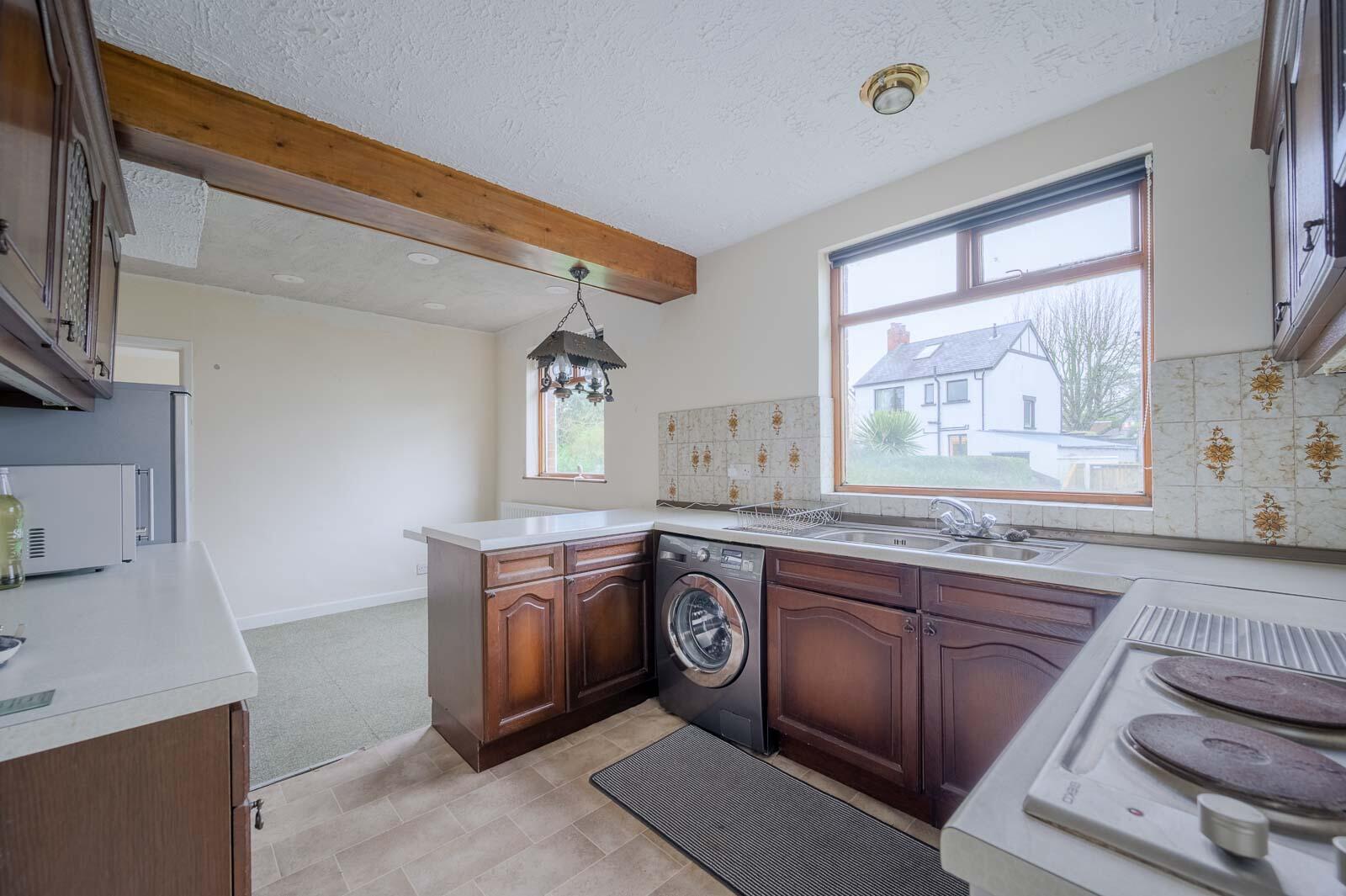 Kitchen/Dining - 5.49m x 3.63m (18'0 x 11'11) - Range of high and low level units, integrated oven, four ring hob above, enclosed extractor fan, stainless steel sink and a half with drainer and chrome mixer tap, space for washing machine, space for fridge freezer, peninsula breakfast bar/dining area, laminate work surface. Access door to side. Ample space for dining and outlook to rear garden.