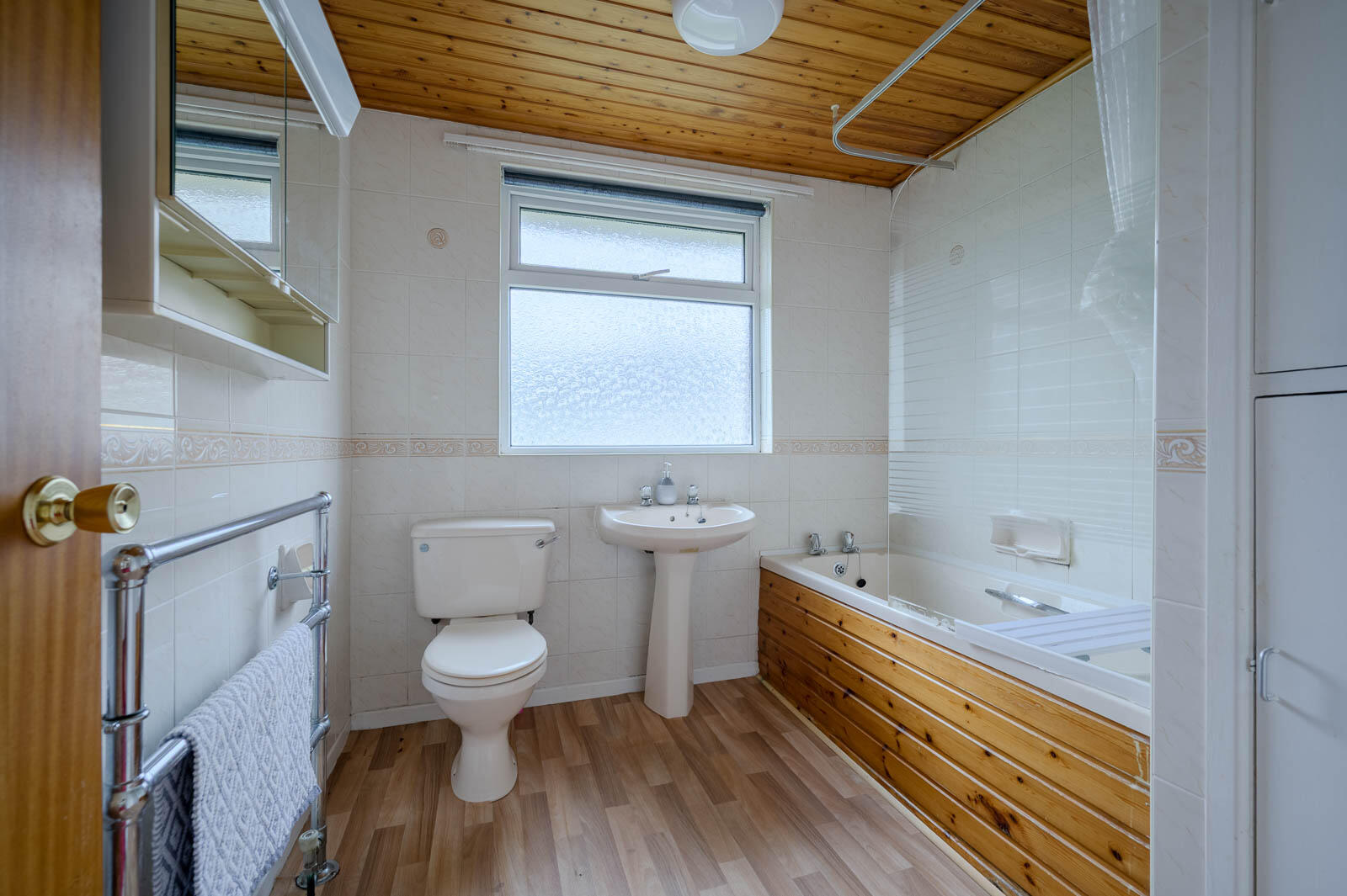 Bathroom - 2.46m x 2.36m (8'1 x 7'9) - Cream suite comprising of low flush WC, pedestal wash hand basin with hot and cold taps, panelled bath with hot and cold taps, thermostatically controlled shower, telephone handle attachment, tiled walls, laminate wood effect floor, chrome heated towel rail, hotpress cupboard with shelving.