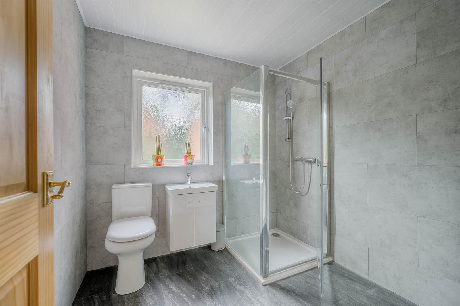 Ground Floor Shower Room - 2.26m x 2.18m (7'5 x 7'2) - White suite comprising of low flush WC, wall hung wash hand basin, chrome mixer tap, vanity storage below, walk-in thermostatically controlled shower, telephone handle attachment, glazed shower screen, uPVC tile effect walls and laminate tile effect floor, uPVC tongue and groove ceiling.
