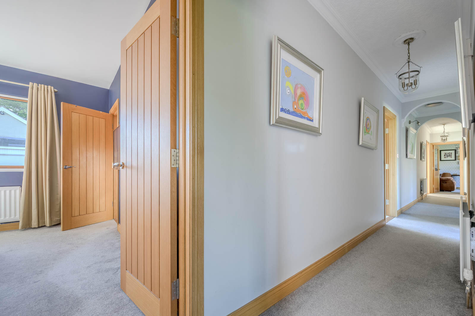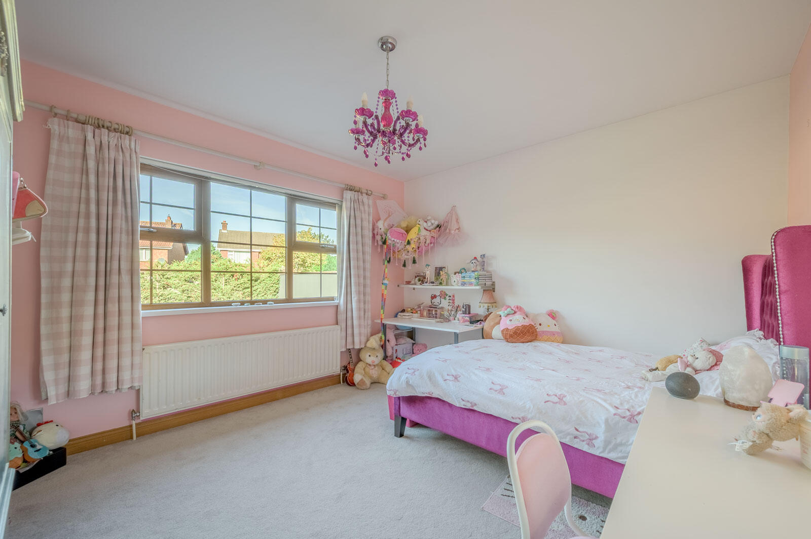 The property offers four bedrooms, including a primary suite with walk-in wardrobe and en suite shower room. Additional bedrooms are generously proportioned and well-served by a family bathroom with both roll-top bath and walk-in shower, combining style with practicality.