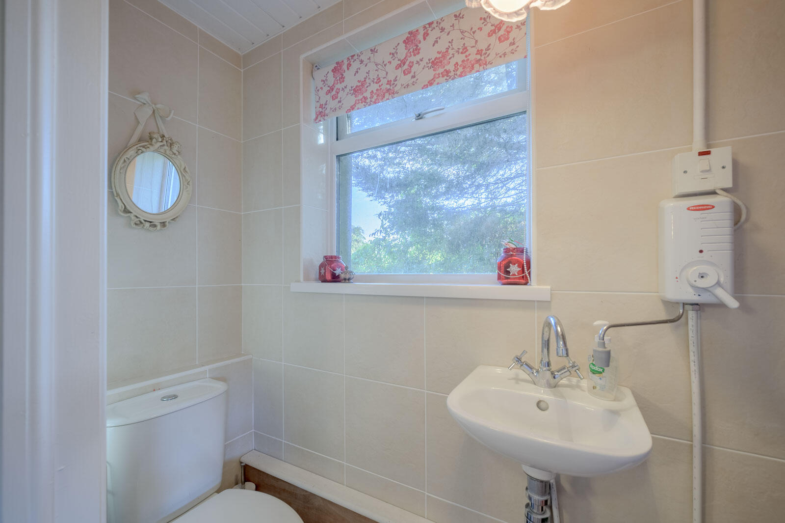 En Suite Shower Room - 2.87m x 1.17m (9'5 x 3'10) - White suite comprising of half pedestal wall hung wash hand basin, chrome mixer tap, low flush WC, walk-in electric shower, telephone handle attachment, fully tiled walls, inset spotlights, extractor fan, feature tiled floor.