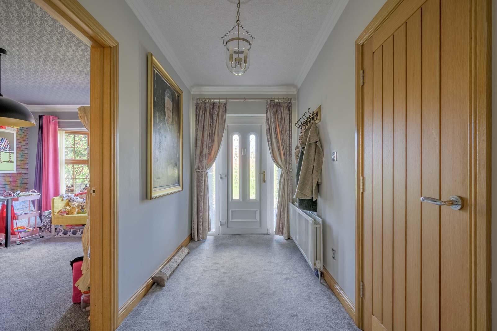 You are welcomed into a generous reception hall with cloak storage and cornice detailing. The accommodation is thoughtfully arranged, offering both formal and informal spaces. To the front, a family room with bow window enjoys natural light and features a central wood-burning stove, creating a warm and inviting focal point.