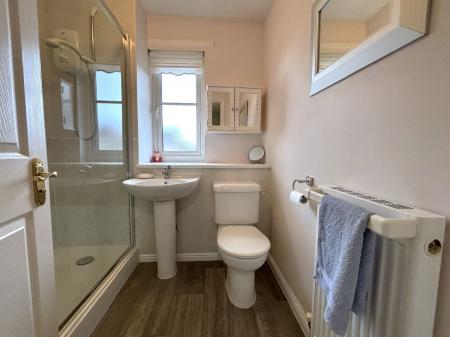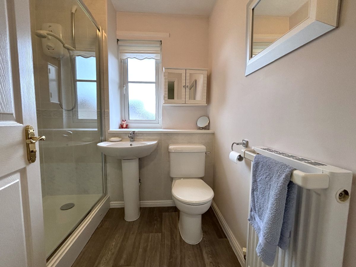 Driveway leads up to front door and into entrance hall. The bright airy lounge offers ample room for typical lounge furniture and boasts fitted storage cupboard. Door opens to the well-appointed kitchen/diner which boasts integrated oven and gas hob with space for free-standing appliances. The generously proportioned room easily accommodated a family dining suite. Sliding patio doors open to the garden. On the upper floor there are two good-sized double bedrooms that both provide fitted mirrored wardrobe storage. The modern shower room with double walk-in cubicle and electric shower - completes the accommodation. The property benefits from gas central heating and double glazing.