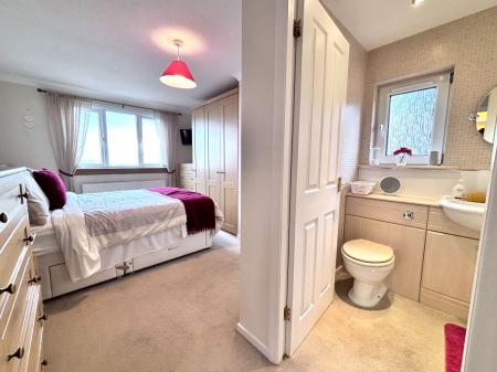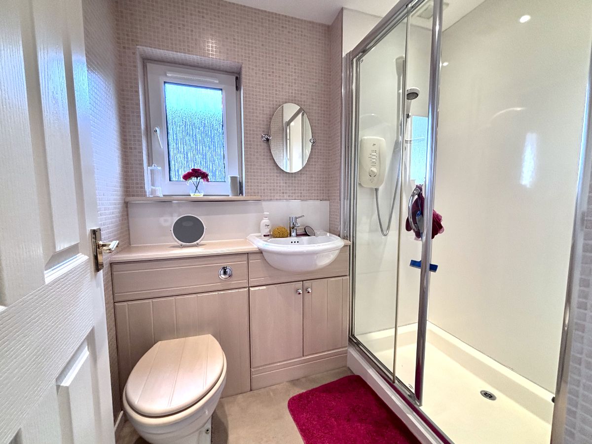 Stairs lead to front door which opens to a spacious welcoming hallway with under-stair storage and access to downstairs WC. Panel-glazed doors open to lounge and kitchen. The bright and airy lounge and dining room boasts a dual aspect and provides ample room for typical lounge and dining furniture. Door opens to a modern well-appointed fitted kitchen with generous storage, integrated appliances (include separate fridge, freezer, slimline dishwasher, washing machine, oven, grill & hob). There is space for everyday dining, and a door leads out to rear garden. On The upper land there is a storage cupboard with access to attic. There are four good-sized bedrooms. The front-facing master bedroom boasts fitted wardrobe storage and access to a modern en-suite shower with double cubicle. Two further bedrooms provide fitted storage. The 4-piece bathroom completes the accommodation. The property benefits from gas central heating and double glazing. Externally there is a driveway for two or more cars leading to a detached garage. The front garden is laid with lawn and planted bushes. To the rear, the garden boasts two patio areas and drying area, which is ideal for outdoor entertaining.