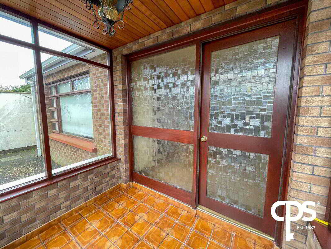 The sunroom area boasts tiled flooring while also allowing access to the rear of the property through patio doors.